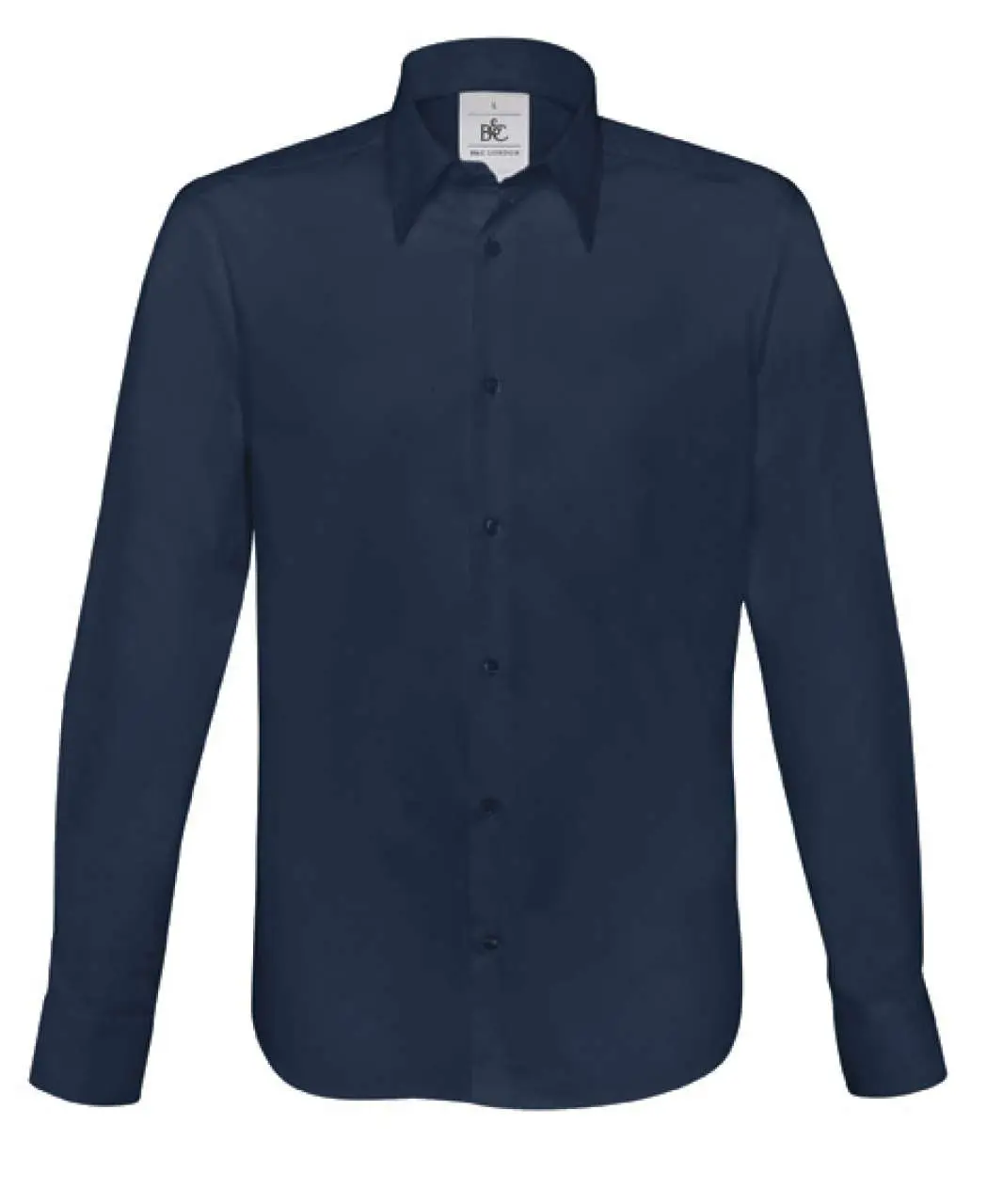Long-sleeved Poplin shirt Combed cotton/elastane stretch fabric Buttons in matching colour Fitted No pleat on back panel for optimal printing and embroidery 2 spare buttons 40°C washable