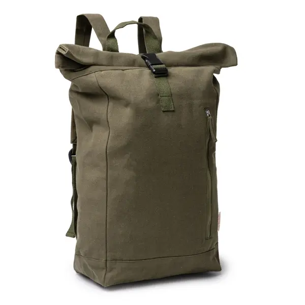 Recycled cotton backpack of 370 g/m². Large main compartment with extendable opening with zip and adjuster. Front pocket with zip closure and side pocket. Capacity: 25L
