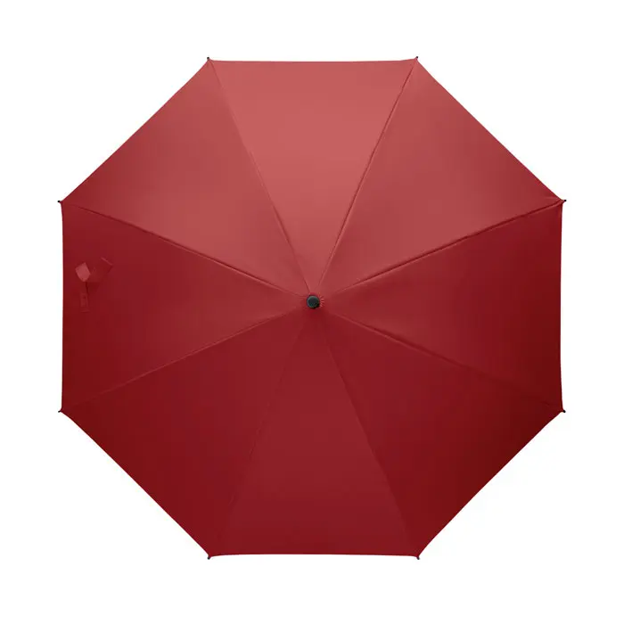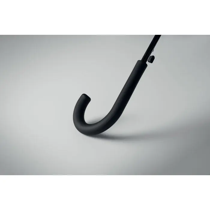 23 inch straight auto open umbrella with black plating metal frame, fibreglass ribs and panels in 190T pongee fabric. Plastic tips and top. Rubberized PP plastic curved handle. Manual closure.