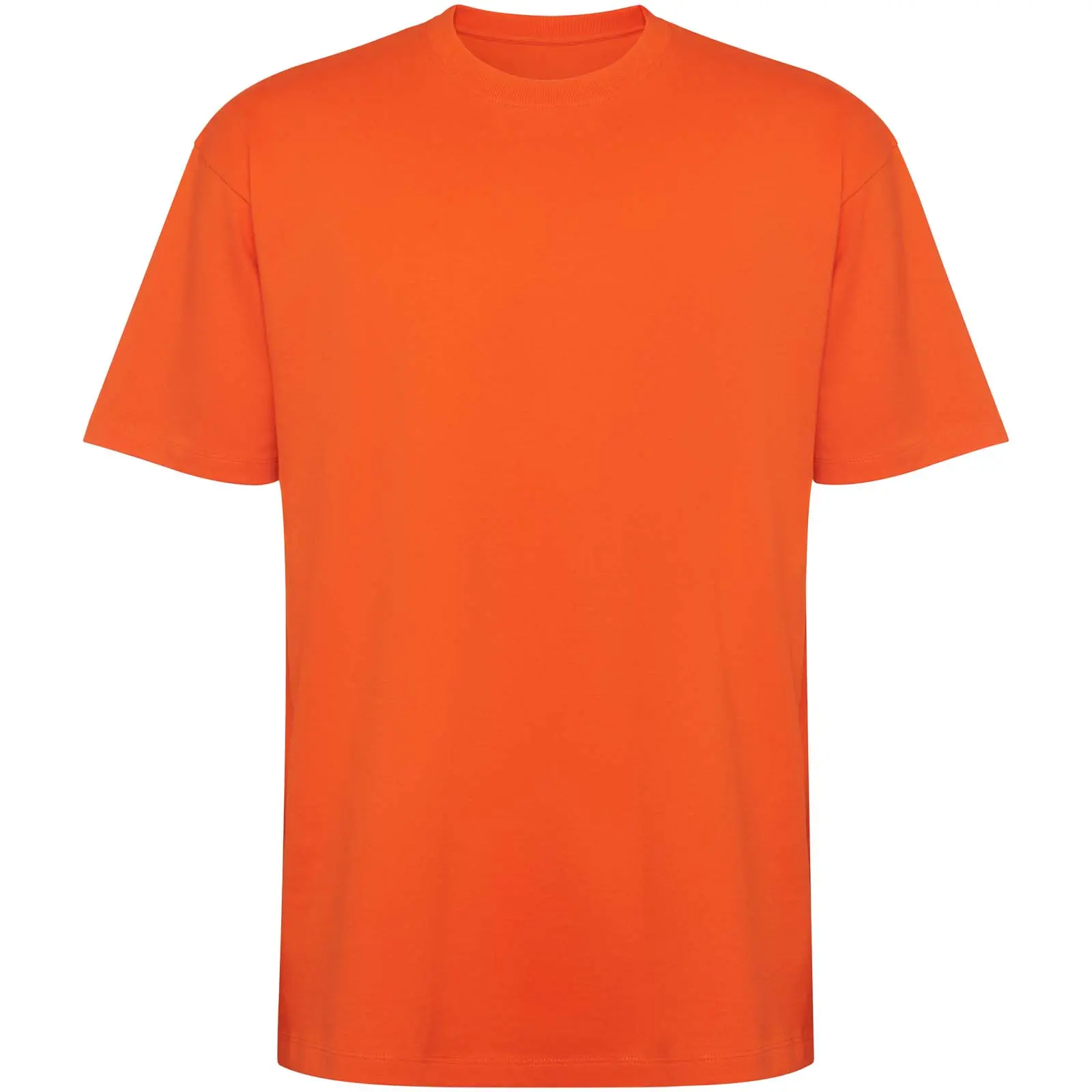 Oversized short sleeve t-shirt. Round collar trimmed in 2x1 rib with matching seam covers. Side seams. Wide double stitching on the sleeves and hem. Removable label.