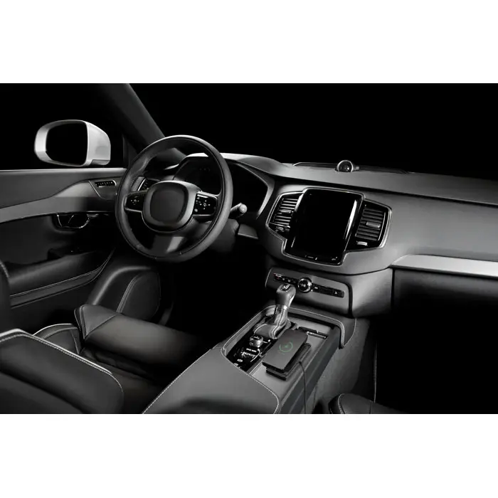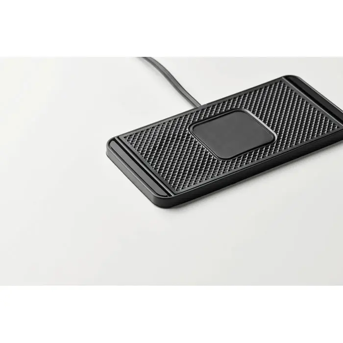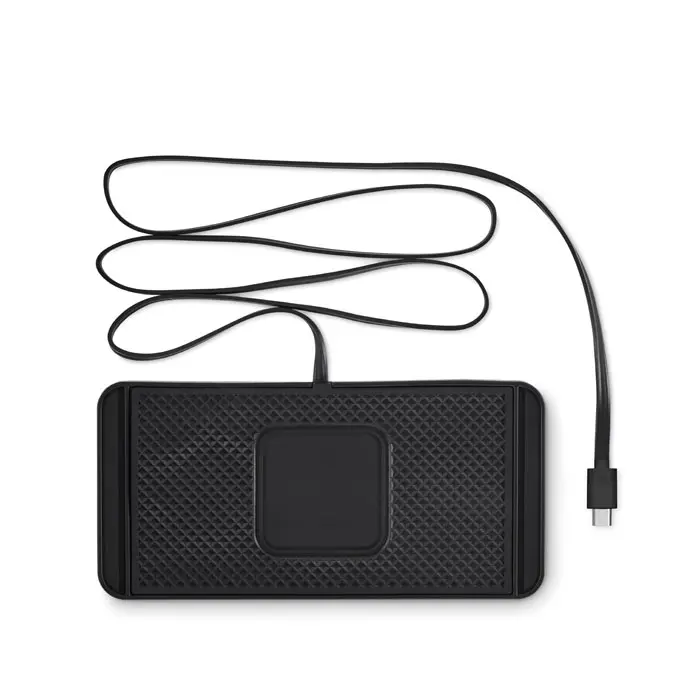 Car wireless charger 15W, anti slip pad in PVC. Adjustable as the edges can be cut to fit the required size. Integrated USB A cable, length 120 cm