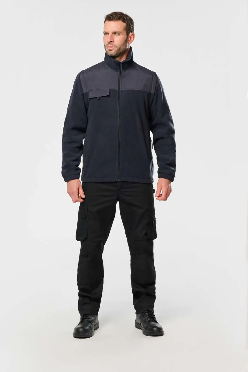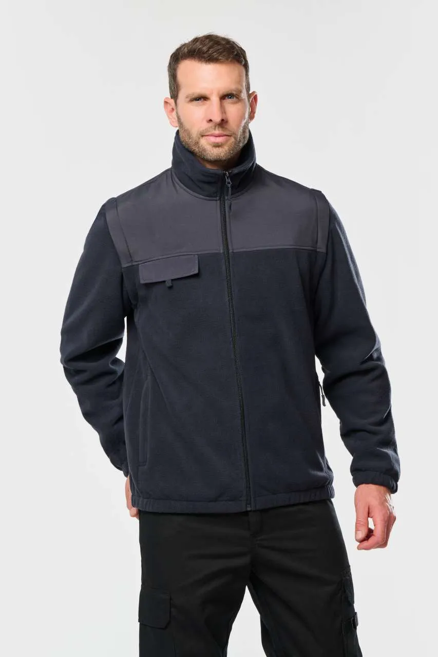EX KA9105 100% polyester Outer: 100% polyester - 400 gsm Reinforced inserts in 100% polyester taslon with acrylic coating Polyester 210T inner sleeve lining 2 in 1 fleece jacket 2 zipped front pockets and 1 chest pocket with flap and tear release fastening Tone on tone large yokes on shoulders and lower arms Easy decoration access at front and back Polyester lined removable sleeves for added comfort Elasticated cuffs and hem