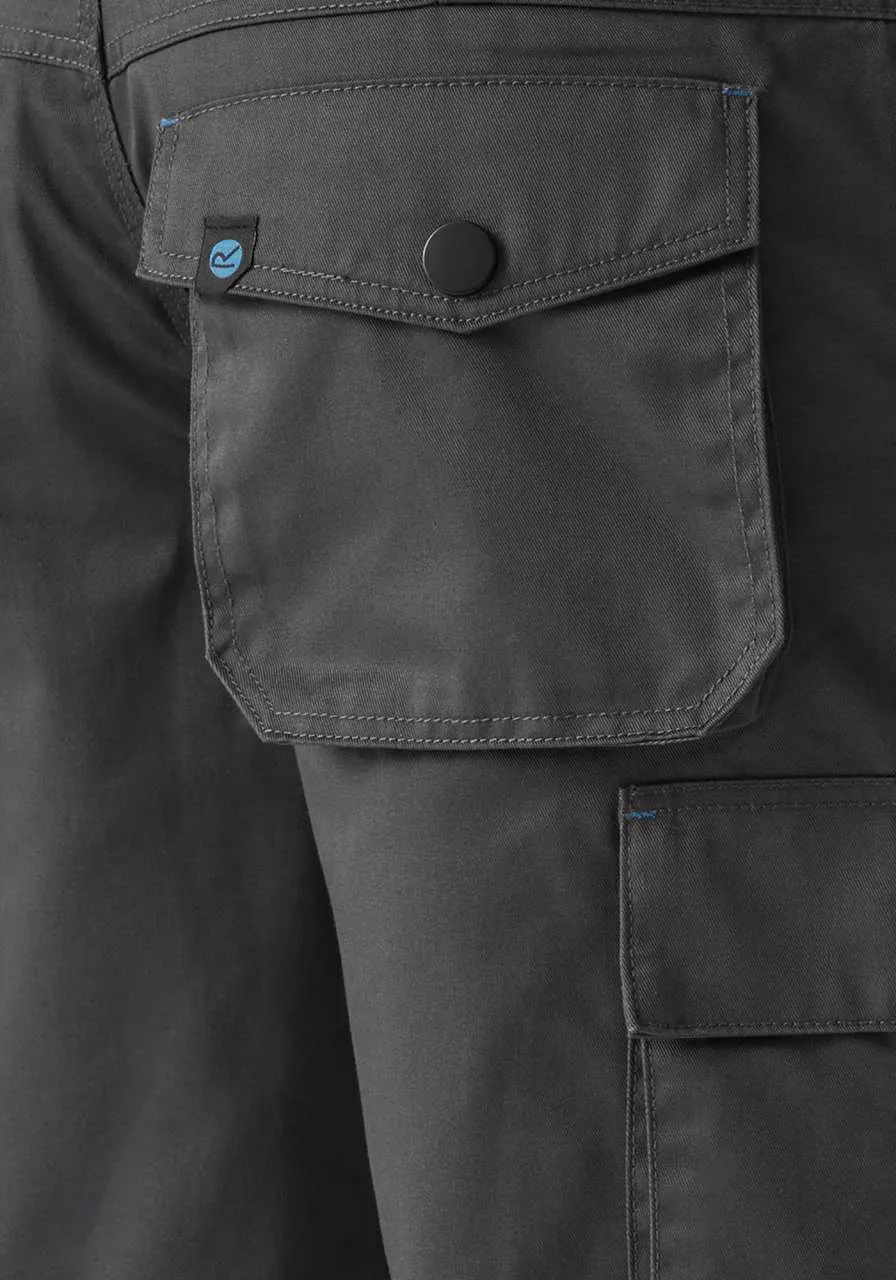 Fabric Information Hardwearing polycotton fabric 65% polyester 35% cotton fabric Fabric weight 245 g/m2 Durable water repellent finish Special Features Part elasticated waist Belt loops Zip fly opening Metal Shank button to CF fasten 2 Front pockets 1 side cargo pocket button fasten, 2 rear pockets Side leg Ruler pocket Reinforced crotch seam Reinforced seams with triple stitching