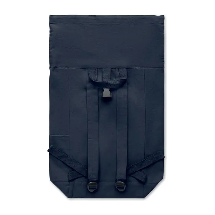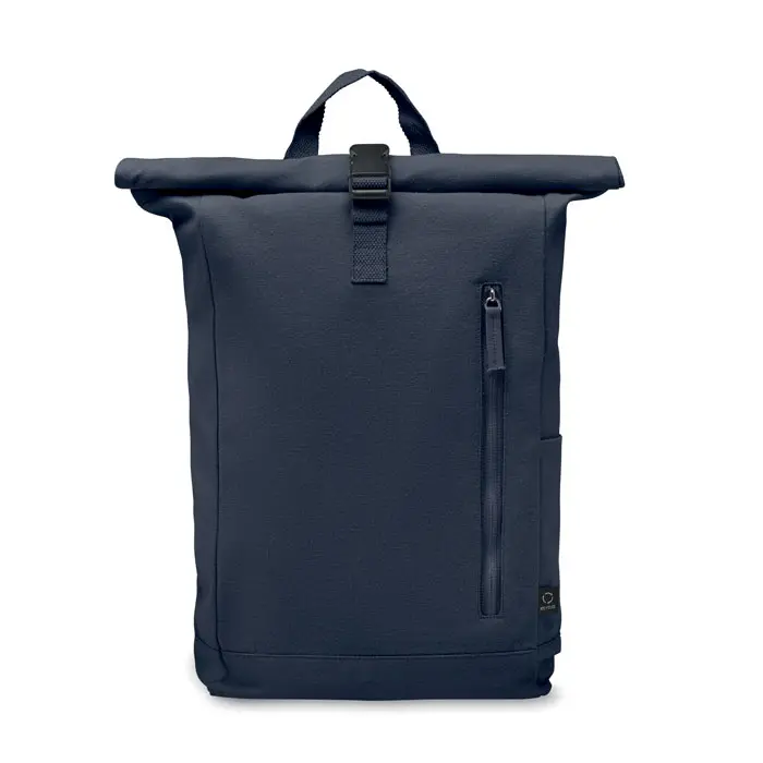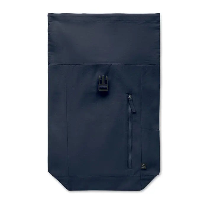 Roll top backpack with hook and loop closure in 390 gr/m² recycled cotton (80%) and recycled polyester (20%). Zippered front pocket.