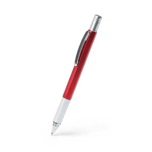 Multifunction ball pen with the following tools: level, ruler in centimeters and inches, flat screwdriver and star screwdriver. Main body available in different colours. Rotating mechanism. Blue ink.