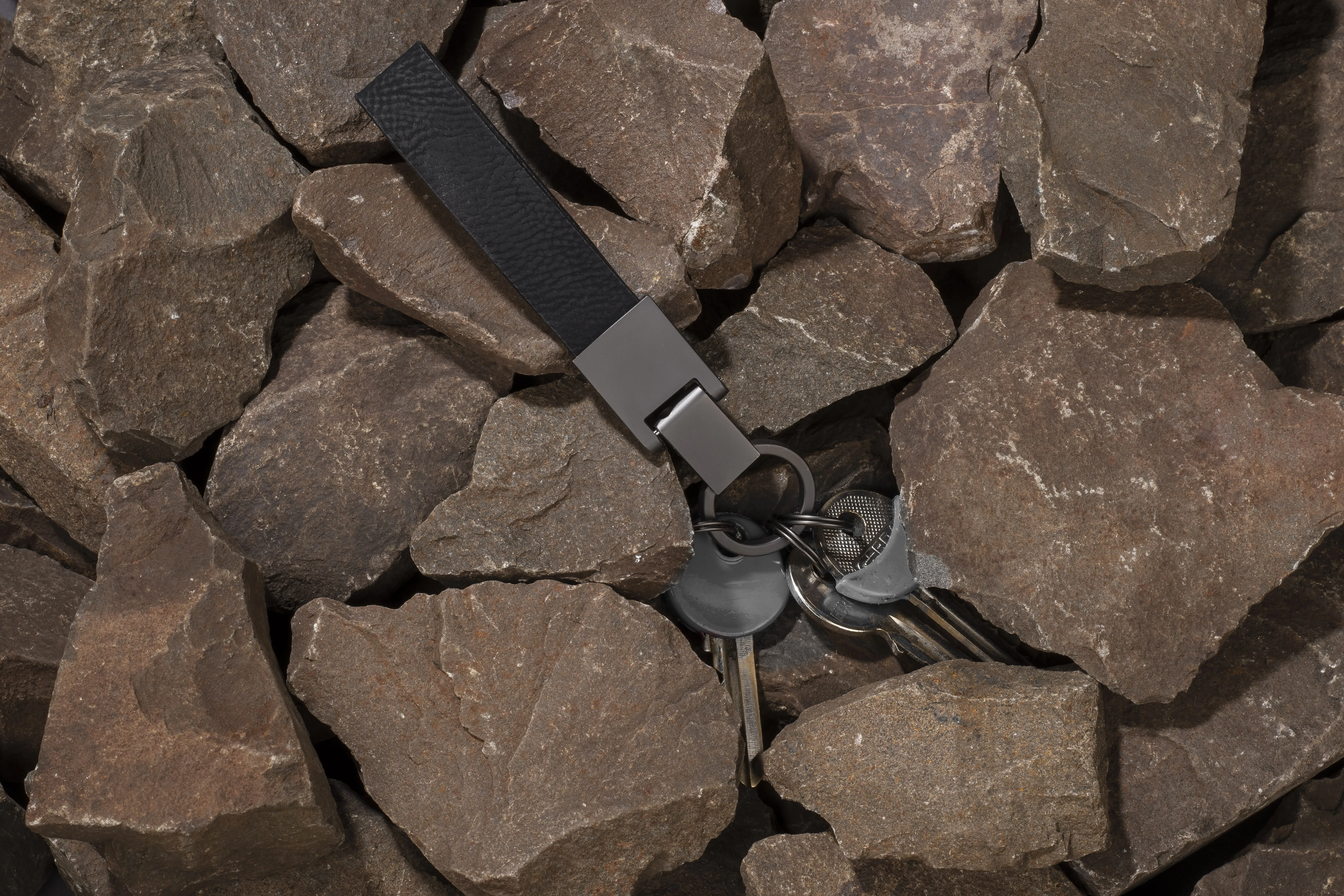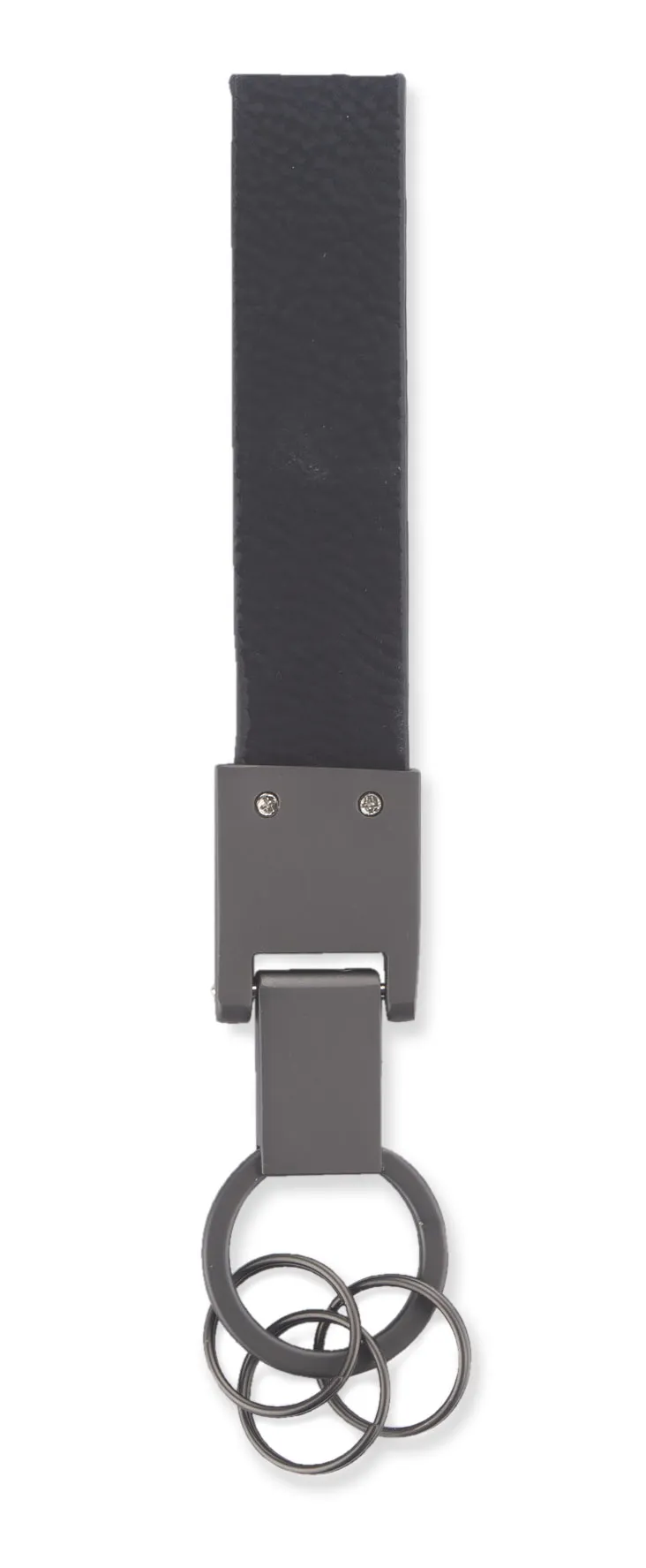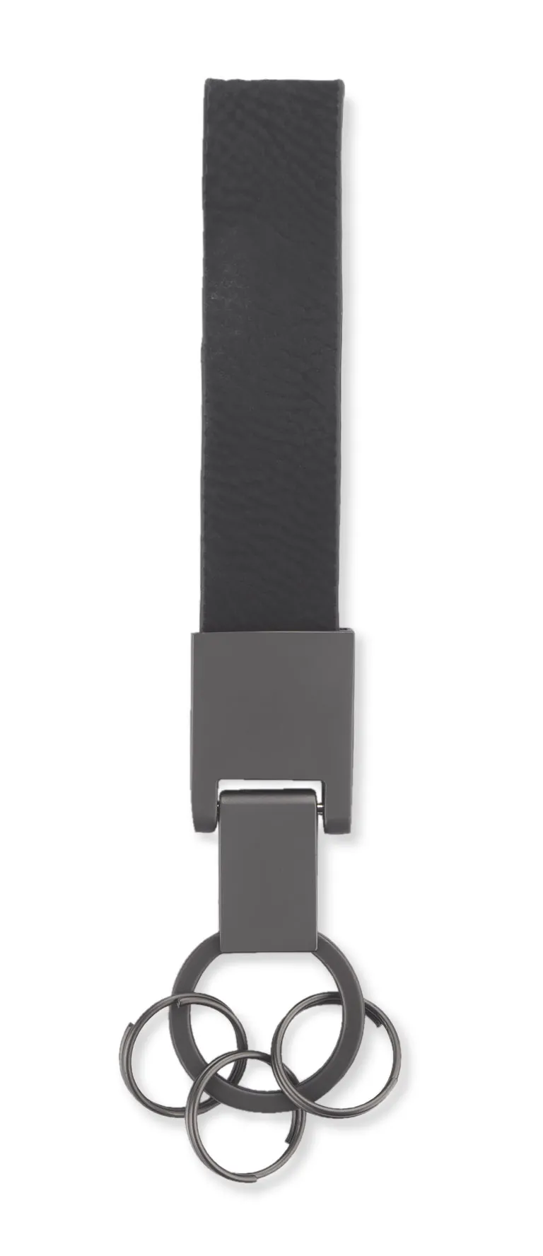 The DERI keychain is an elegant promotional gadget made from high-quality eco-friendly leather with dark metal accents. Its minimalist design and three additional rings allow for easy organization of keys or attachment of accessories. It comes packaged in a stylish cardboard box, making it an ideal corporate gift.