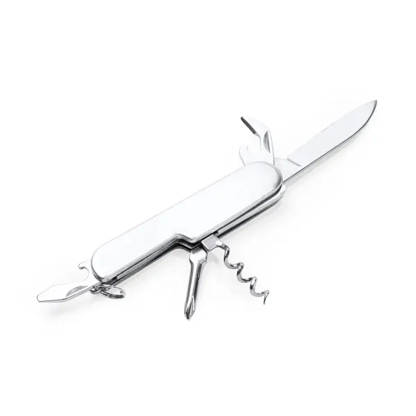 Stainless steel multipurpose jackknife with 6 functions: knife, bottle opener, can opener, corkscrew, screwdriver and keyring.