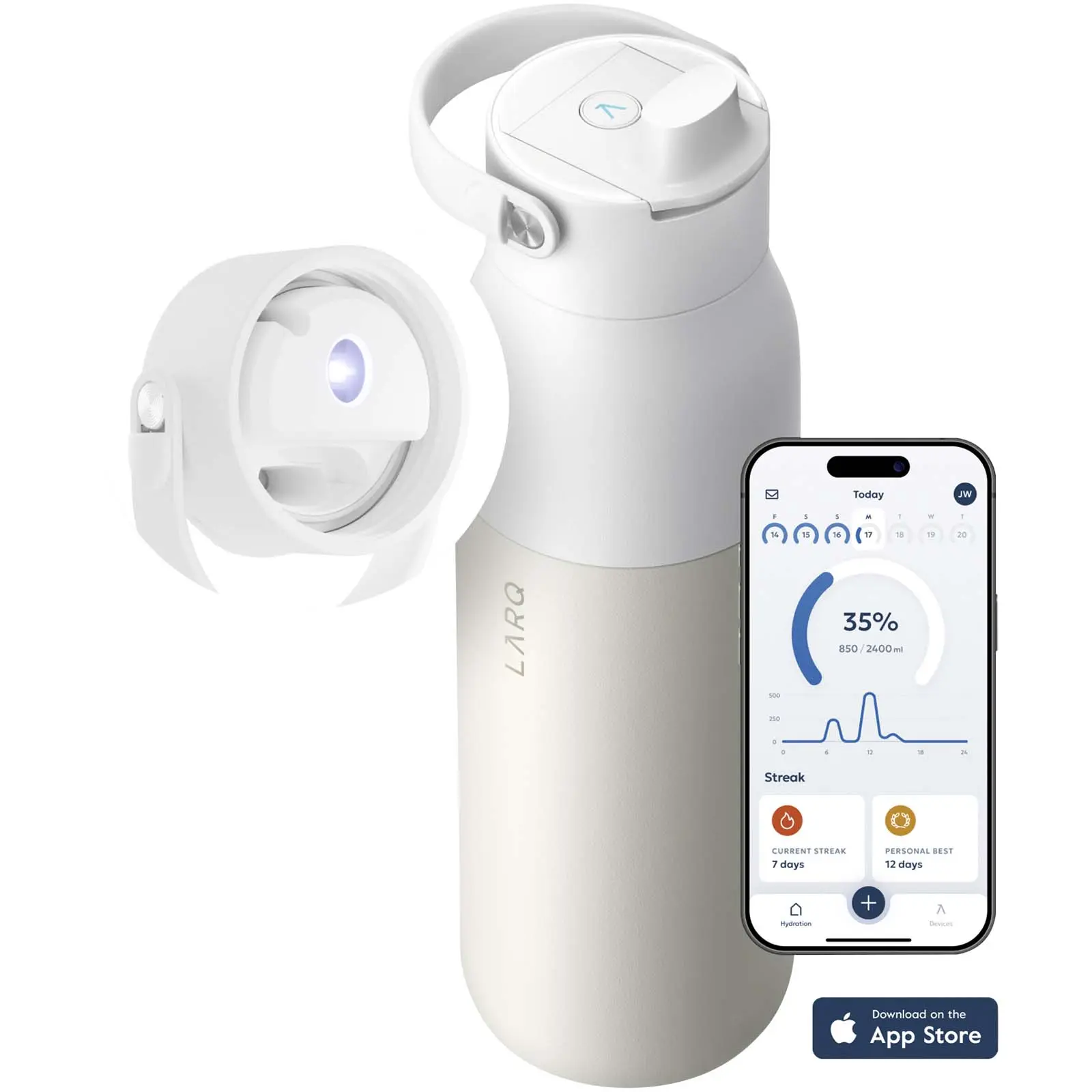 The LARQ PureVis™ 2.0 water bottle is a 1000 ml all-in-one self-cleaning and water-filtering bottle with smart hydration tracking. It enhances water quality through a 2-stage filtration and UV-C purification process, delivering cleaner, better-tasting water. The UV-C LED in the cap activates automatically every two hours to keep the bottle clean and odour-free, or you can manually start a PureVis™ cycle at the touch of a button. With a long-lasting battery, the bottle runs for up to 2-3 weeks on a full charge via the USB-C port. The cap features a built-in, detachable soft-touch handle for convenient carrying. Smart sensors track your water intake automatically, while the LARQ app provides insights and progress. Filters should be replaced regularly for optimal performance.