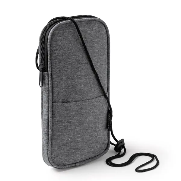 Mobile pouch in RPET polyester. Main compartment with matching zip fastening. Exterior pocket. Matching carry strap included.