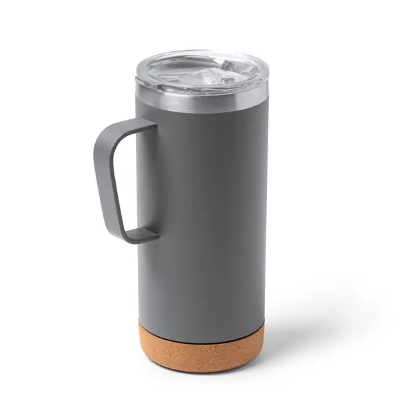 Double-walled metallic tumbler with cork bottom and transparent safety lid. 600 ml capacity. Presentation in eco box.