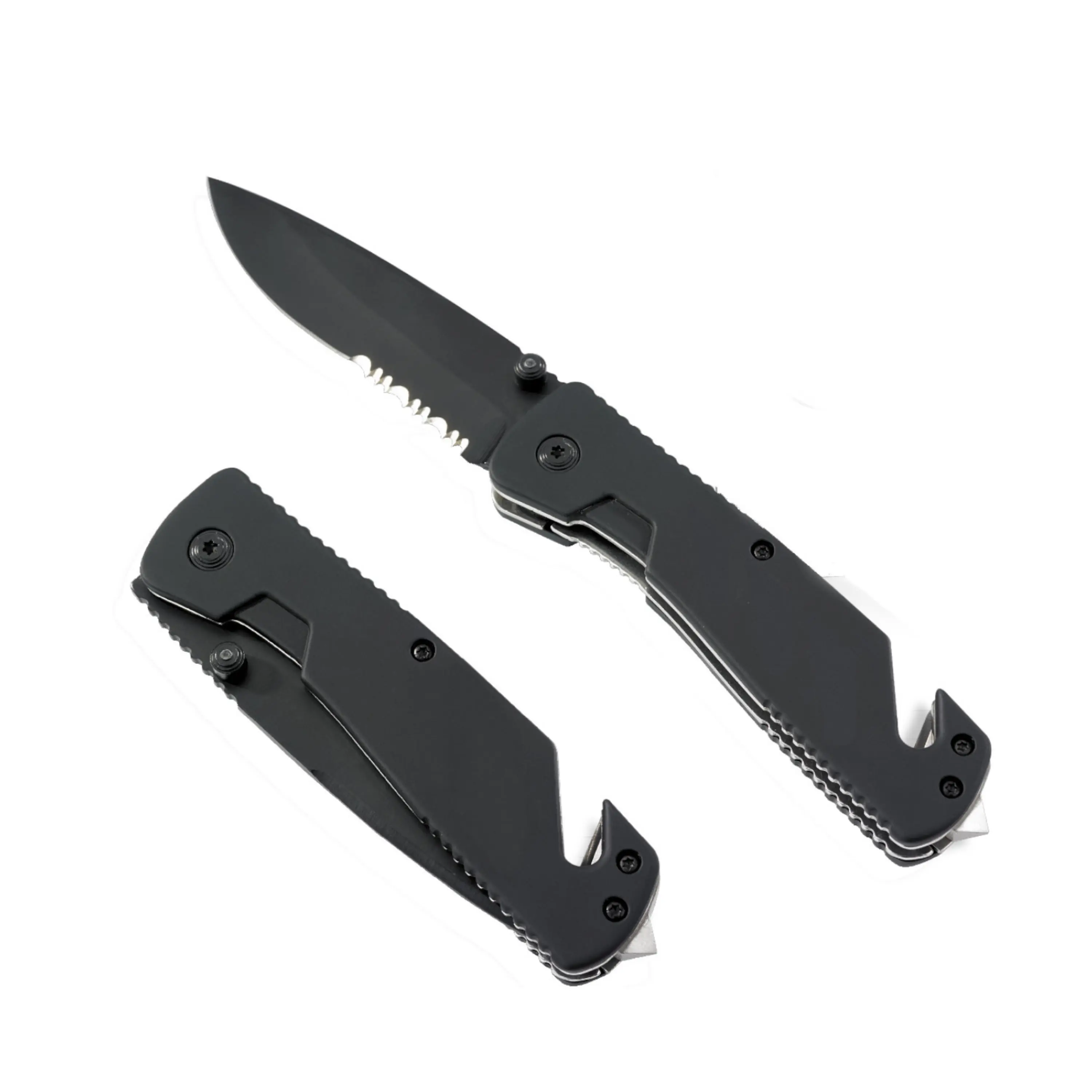 A multifunctional folding knife designed with durability, safety, and versatility in mind, perfect for everyday use as well as emergency situations. Its solid construction and ergonomic details make it an indispensable tool for outdoor enthusiasts, handymen, and those who value practical accessories. • Partially serrated blade made from durable stainless steel, ensuring precise cutting and ease of handling various materials. • Folding design: A compact size when folded, allowing for easy storage and portability. • Ergonomic handle: A sturdy handle coated with anti-slip ABS material, providing a secure grip and safety during use. • Built-in seatbelt cutter, ideal for emergency situations. • Glass breaker made of tungsten – an exceptionally hard and wear-resistant material, perfect for breaking glass in critical situations. • Sturdy locking mechanism: Secures the blade in an open position, preventing accidental closure during use. • Compact design: Easy to carry in a pocket, backpack, or vehicle glove compartment.