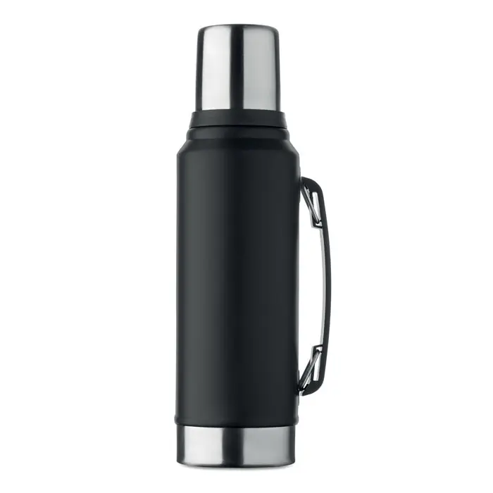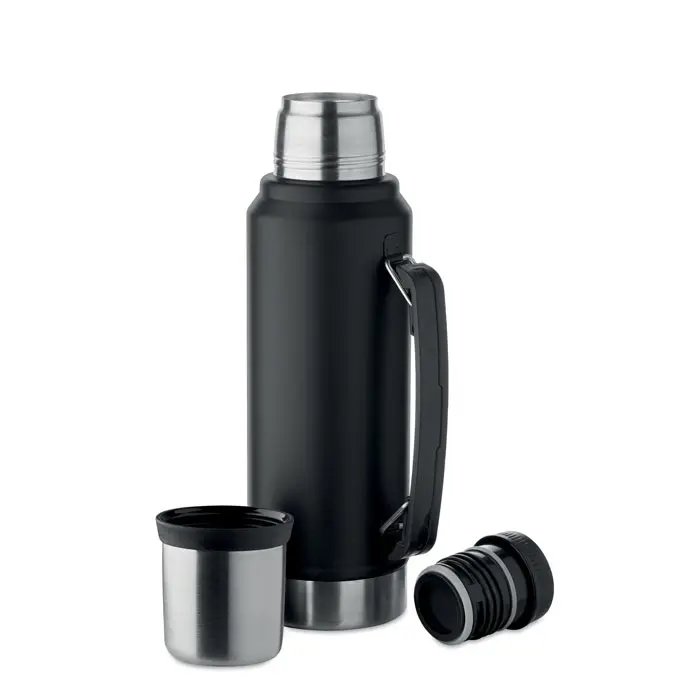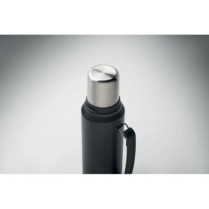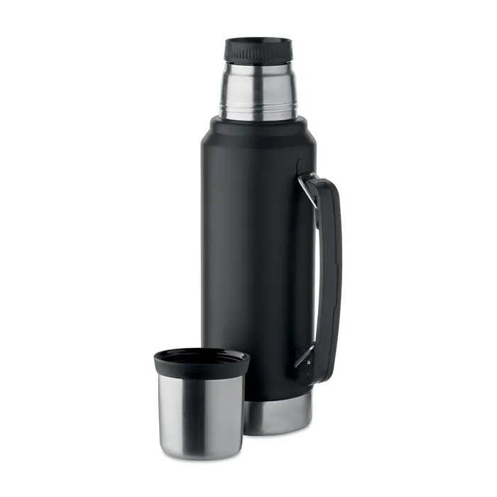 Double wall vacuum insulating bottle in recycled stainless steel (90% recycled stainless steel and 10% stainless steel) with handle on side. With PP lid and recycled stainless steel cup. Leak-free. Capacity: 1L.