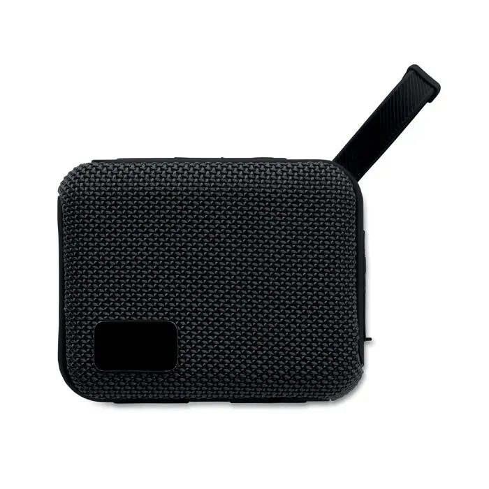 5.0 wireless speaker in ABS with RPET fabric and hanging cord. 1 Rechargeable Li-ION 800 mAh battery included. Includes an SD card port and an AUX/ USB cable. Output data: 5W, 3 Ohm and 5V. Playing time approx. 3h