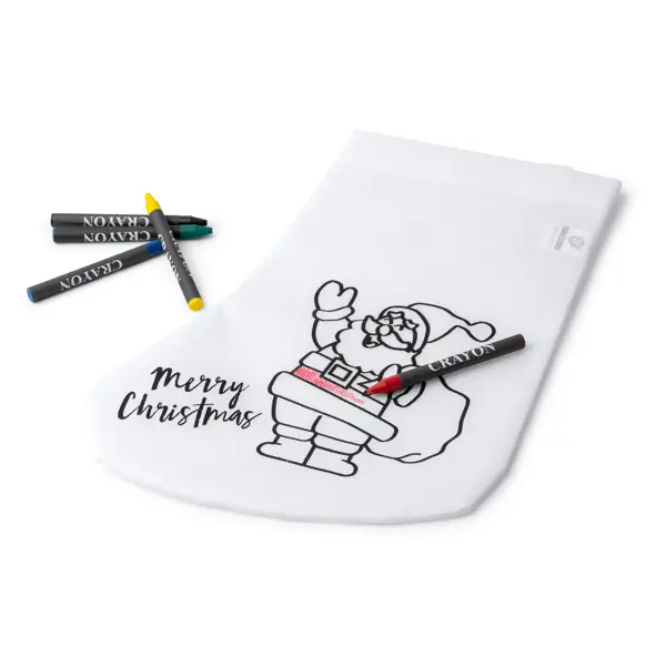 Fun christmas stocking for colouring. Includes 5 colour crayons: blue, red, black, yellow and green.