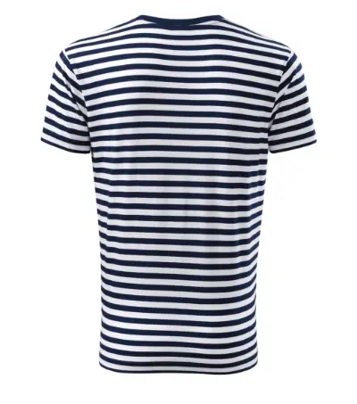 white and navy blue stripes, cut with side seams, narrow 1:1 rib knit neckline hem with 5 % elastane, inner back neckline with a shell fabric tape, fixing shoulder seams