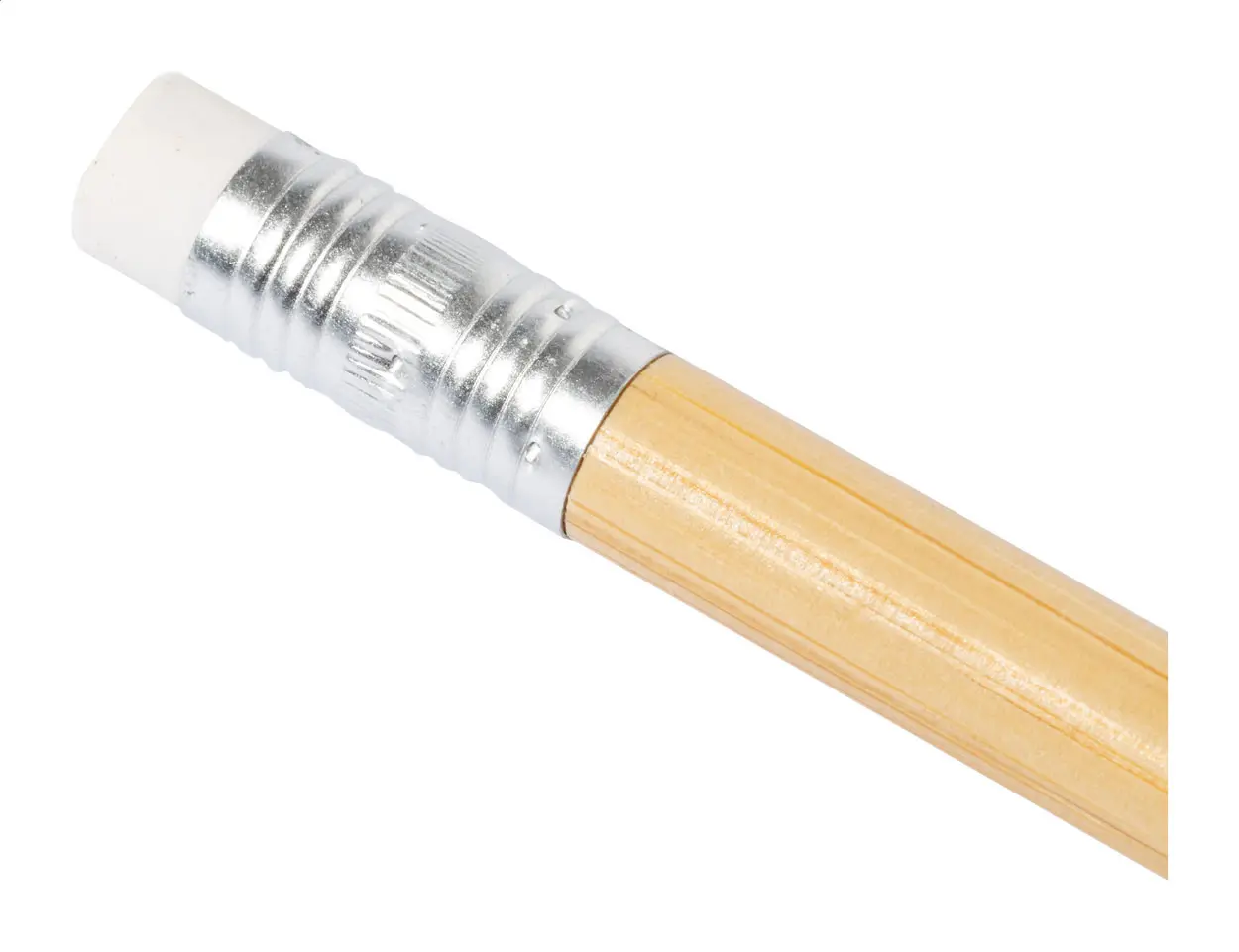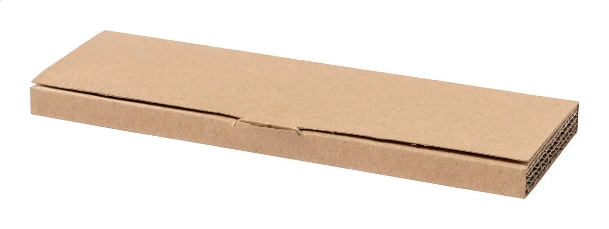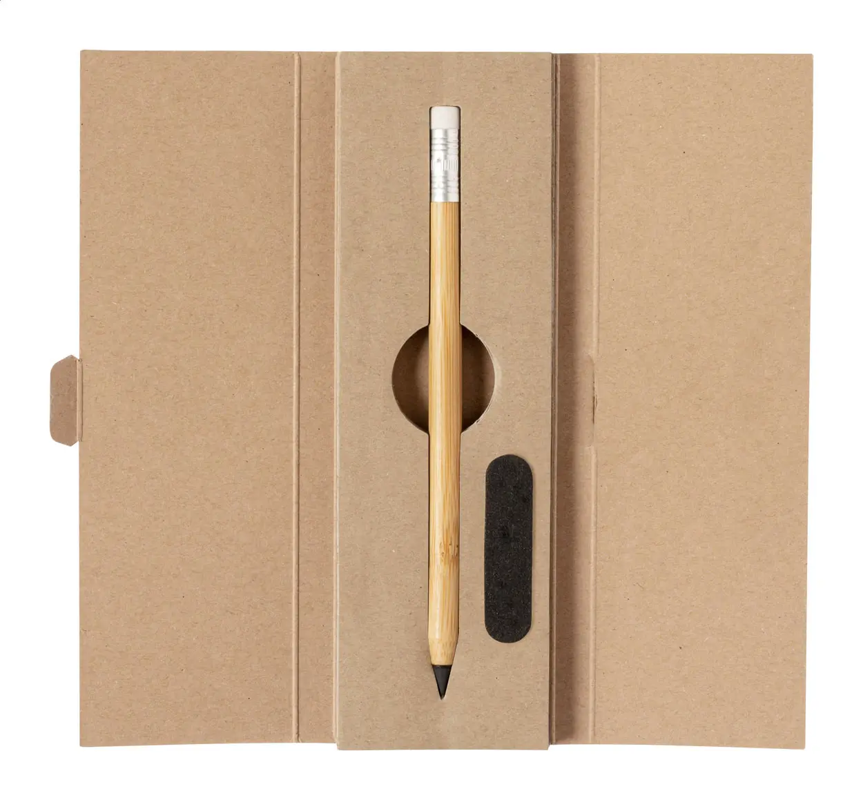 Long-lasting inkless bamboo pen with white eraser and metal alloy tip, which oxidizes the paper. This pen writes similarly to a pencil, and it is also erasable. In recycled cardboard box with sharpening file.