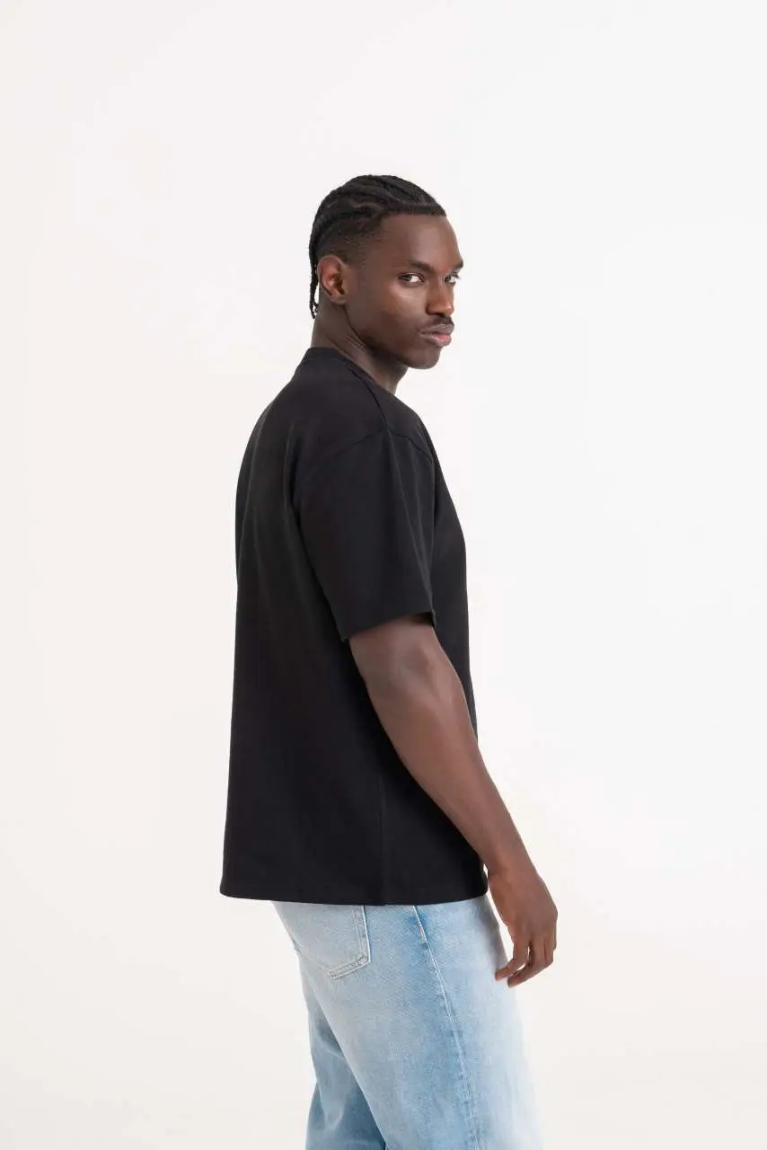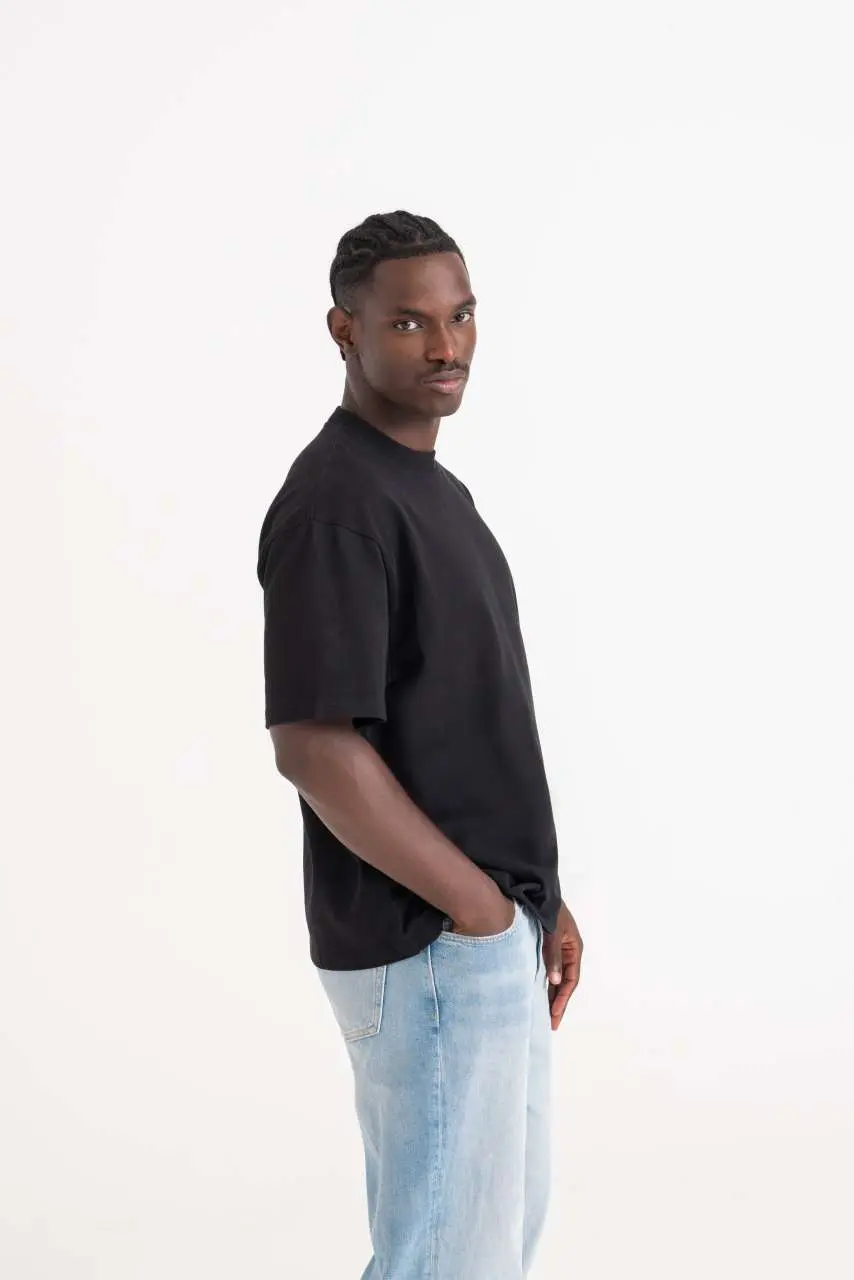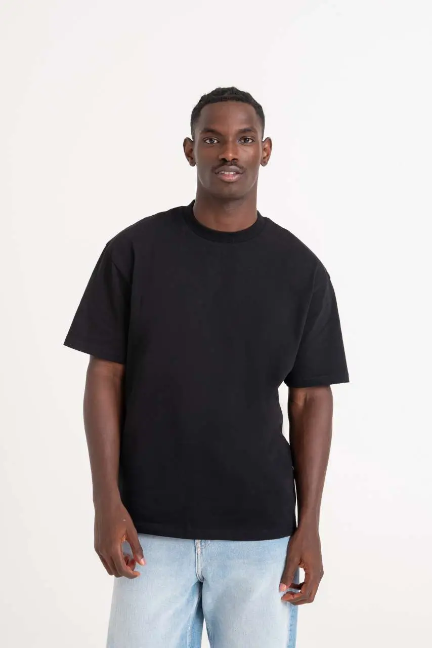100% Combed Ringspun Cotton Oversized fit Side seams Ribbed crew neck Set in sleeve Boxy shape Taped back neck Surface excellent for print or embroidery