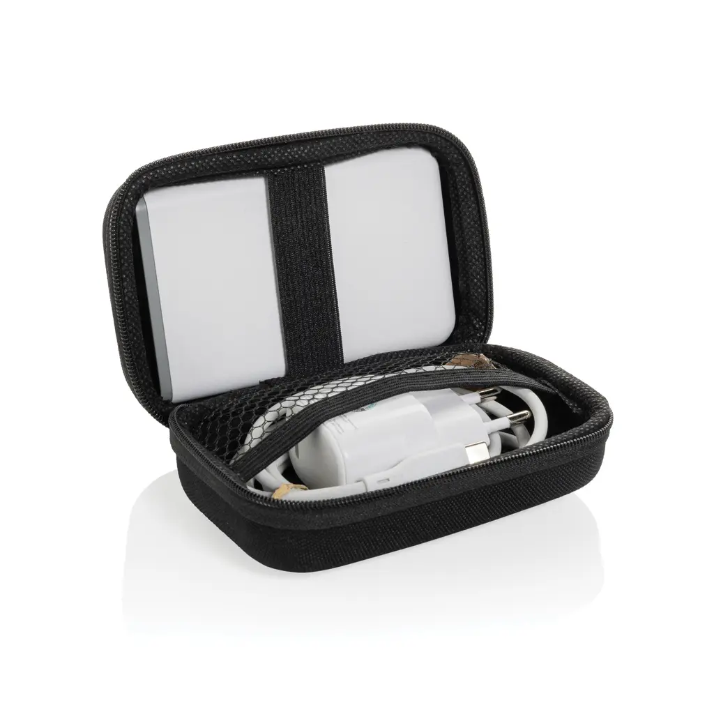 3 pcs 20W fast charging set for mobile devices and other small devices. With EU adapter with 20W USB C port, 5000 mAh powerbank and 120cm recycled TPE 60W fast charging cable (USB C to USB /Lightning). The cable supports data transfer and also charging of larger devices like laptops. Adapter, powerbank and cable made from RCS certified recycled PC, ABS and recycled TPE. Packed in pouch made from RCS certified recycled PET. Total recycled content of whole set: 59% based on total item weight. RCS certification ensures a completely certified supply chain of the recycled materials. Packed in FSC® packaging. PVC Free. Input wall charger AC 100-240V 50/60Hz 0.6A