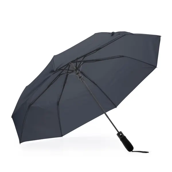 Foldable umbrella with automatic opening. 190T pongee fabric with matching pouch. EVA handle and black metal ribs.