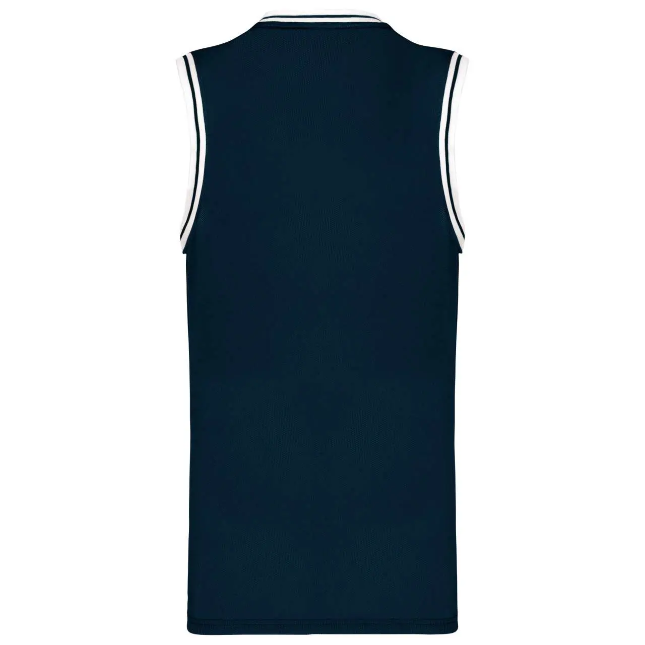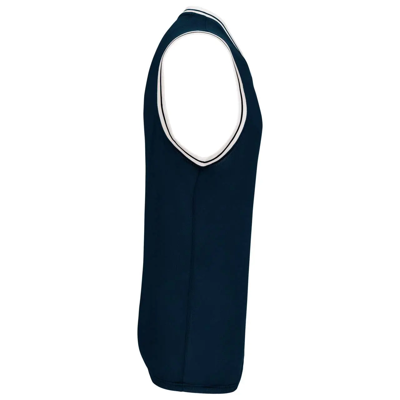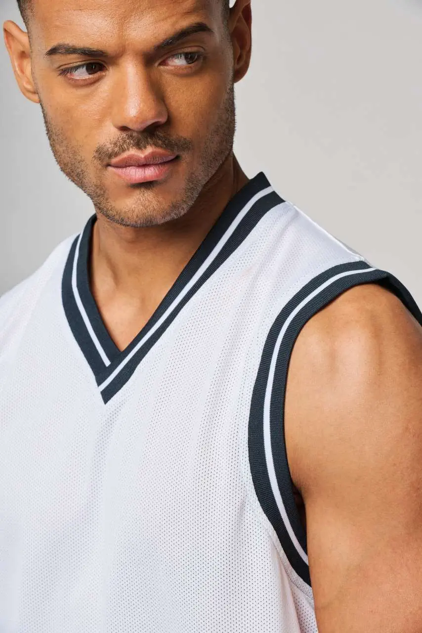 100% polyester mesh V-neck Striped contrasting rib at neck and armholes Twin needle finishing at the hem