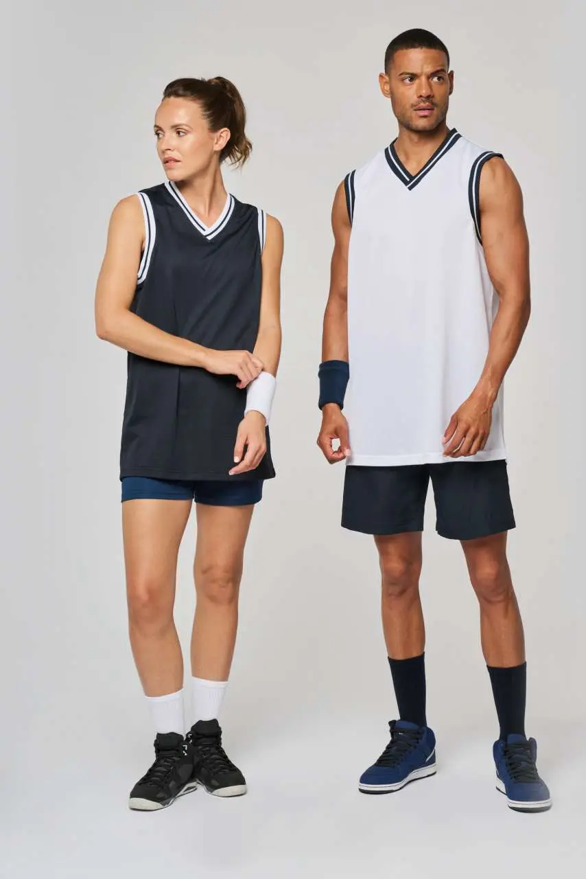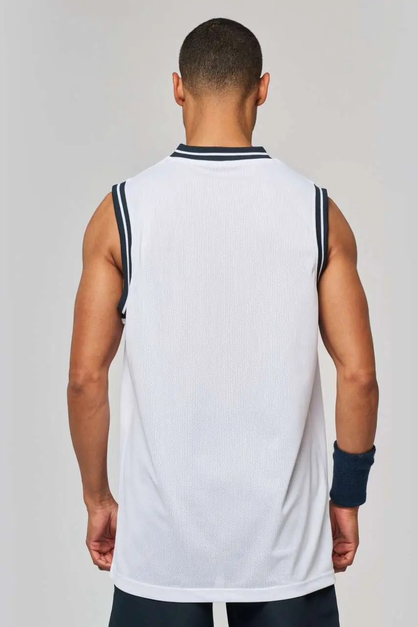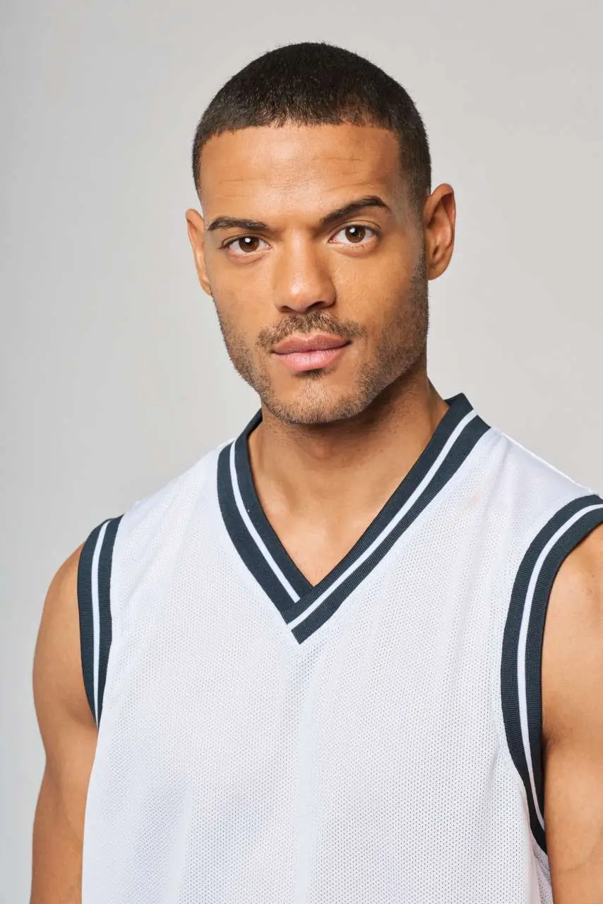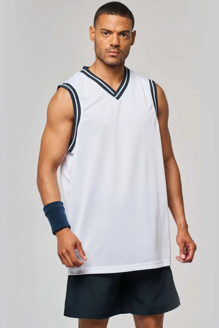 100% polyester mesh V-neck Striped contrasting rib at neck and armholes Twin needle finishing at the hem