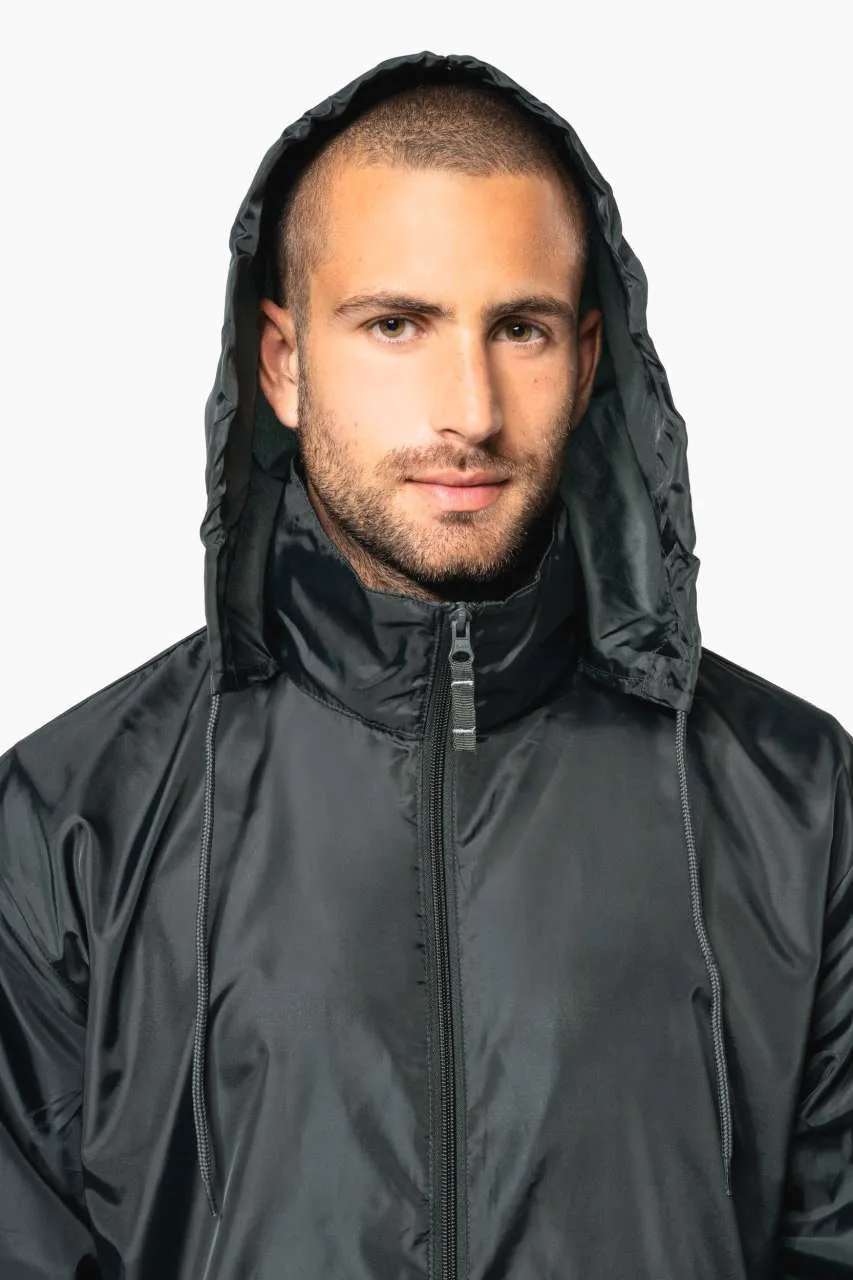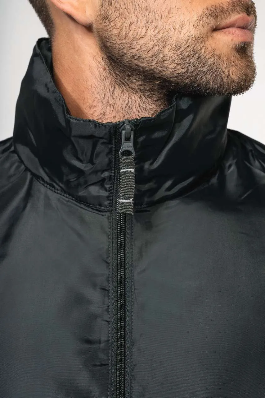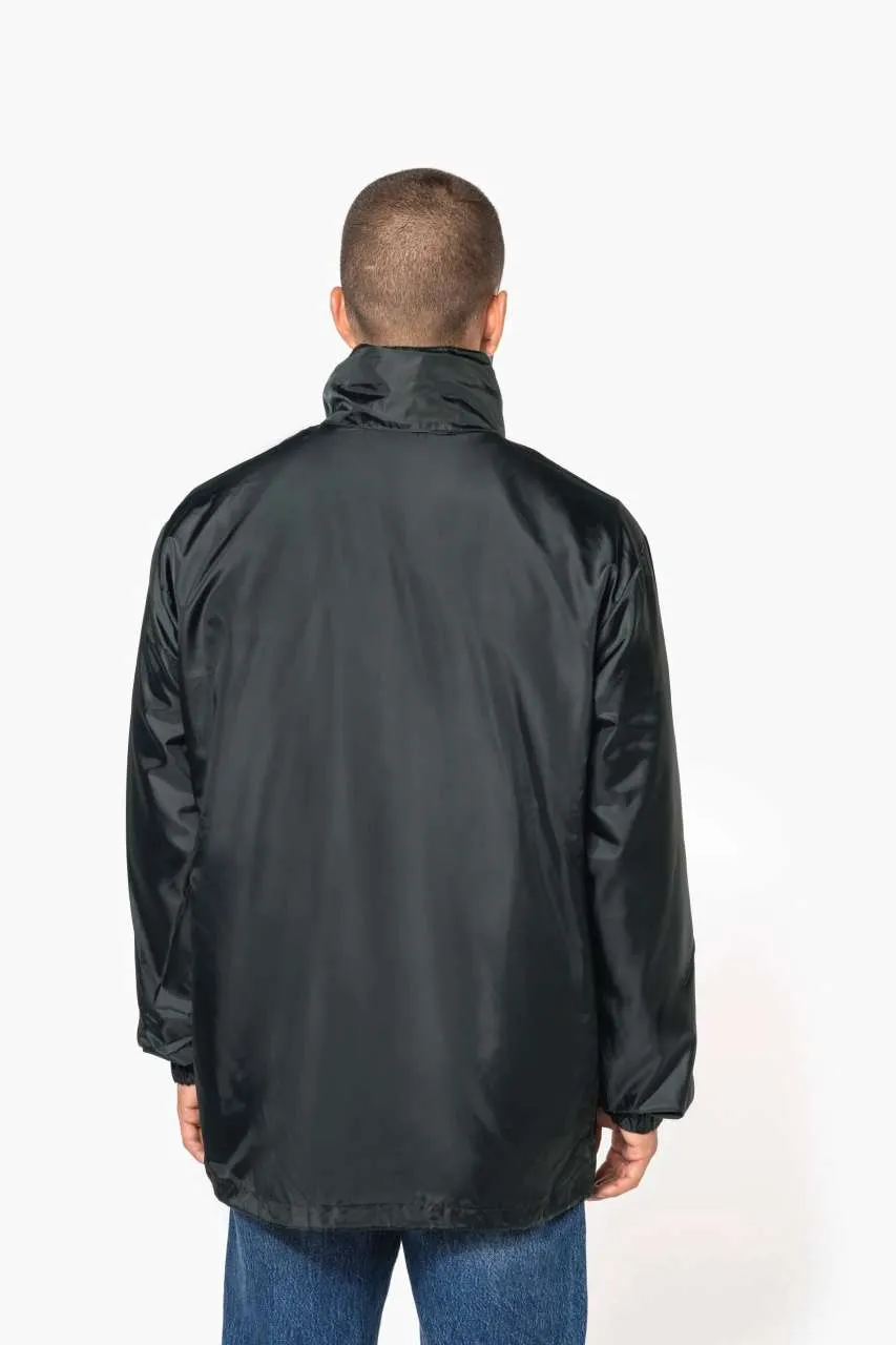 100% polyester Concealed hood with tear release fastening tab 2 front zipped pockets Drawstring at bottom Elasticated cuffs Packs/zips into front pocket Matching full front zip
