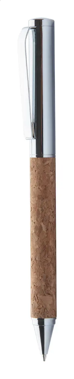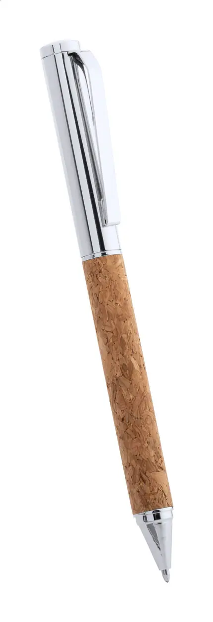 Elegant, metal ballpoint pen with cork covered barrel and shiny chrome finish, in black gift box. With blue refill.