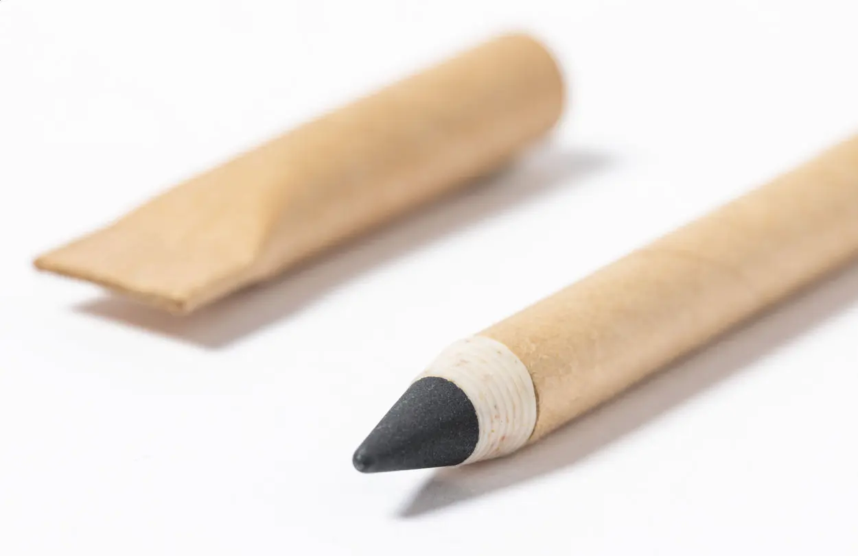 Recycled paper long lasting inkless pen with cap. With metal alloy tip, which oxidizes the paper. This pen writes similarly to a pencil, and it is also erasable.