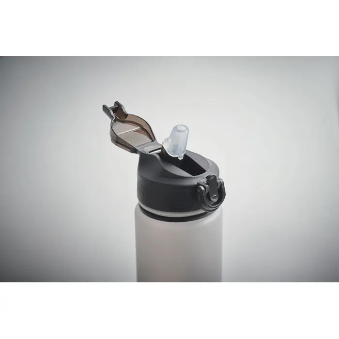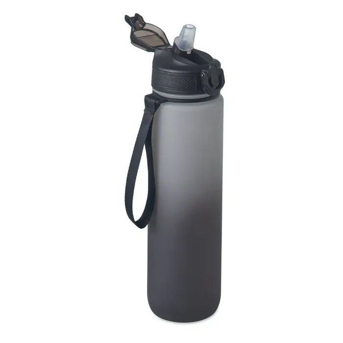 Sports water bottle in RPET with integrated straw, soft silicone mouth piece, motivational time markings, one hand opening flip top lid, safety lock and carrying strap. Capacity 1L.