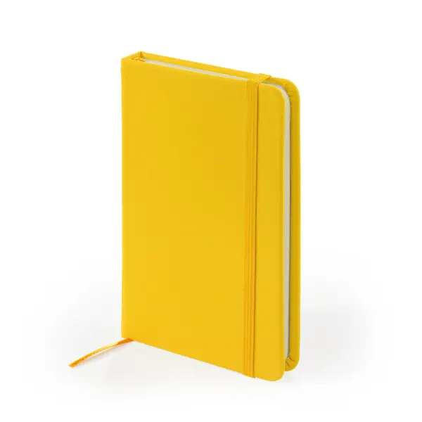 A5 notepad with rigid leatherette covers. Bookmark and elastic band. 100 sheets.