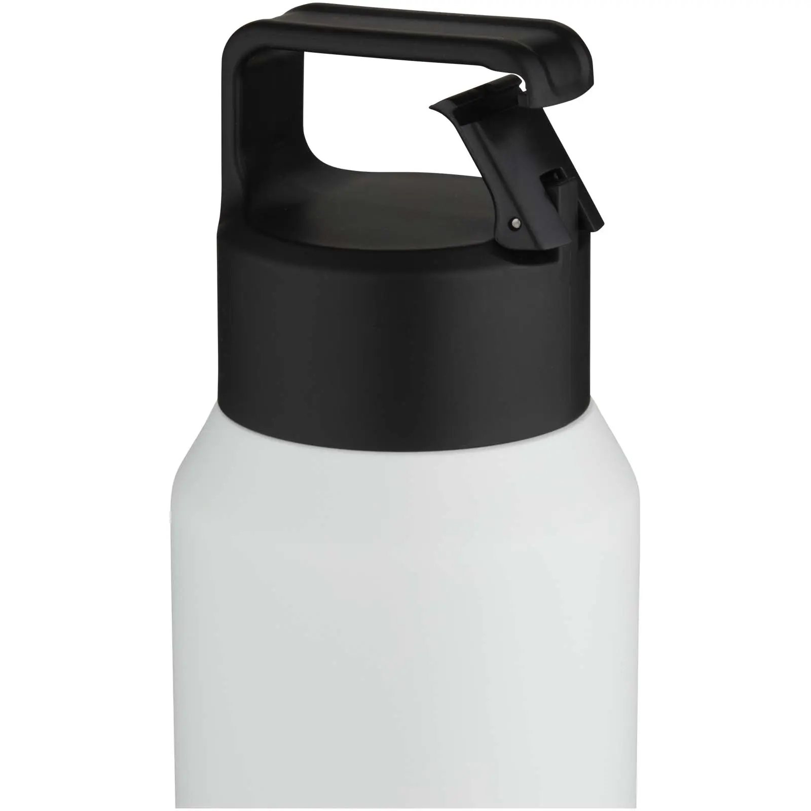 RCS certified stainless steel double-walled copper vacuum insulated water bottle featuring a lid with a built-in carabiner clip, making it easy to attach to a bag or belt. Also suitable for carbonated drinks. Delivered in a recycled cardboard gift box. Volume capacity: 600 ml.