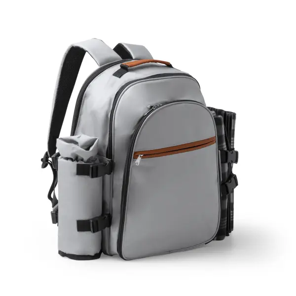 Picnic backpack in RPET polyester. Main compartment including: 2 mugs, 2plates, 2 cutlery sets. Oneside compartment for picnic blanket (included) and one side compartment for bottles.