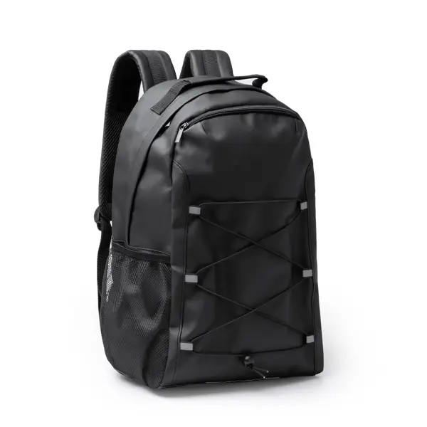 Backpack made of PU leather with reflective details. Large capacity main compartment with interior pocket for 17" laptop. Front with elastic cords and side pocket. Handles with adjuster. Padded back and handles. Capacity: XL