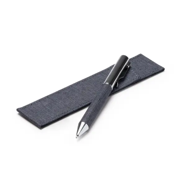 Twist ball pen in metal and RPET polyester. Blue ink. Presentation in a matching RPET polyester pouch.