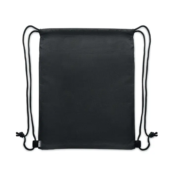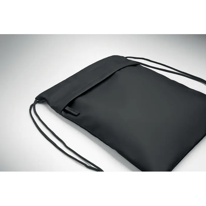 Drawstring bag with PU coated 600D RPET polyester and 190T RPET polyester lining. Zippered front pocket.