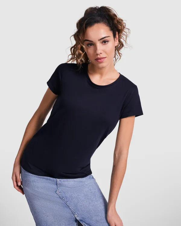 Short-sleeved T-shirt slightly tapered at the waist. Round neckline in matching fabric. Taped neckline in matching fabric. Reinforced stitching detail on hems.