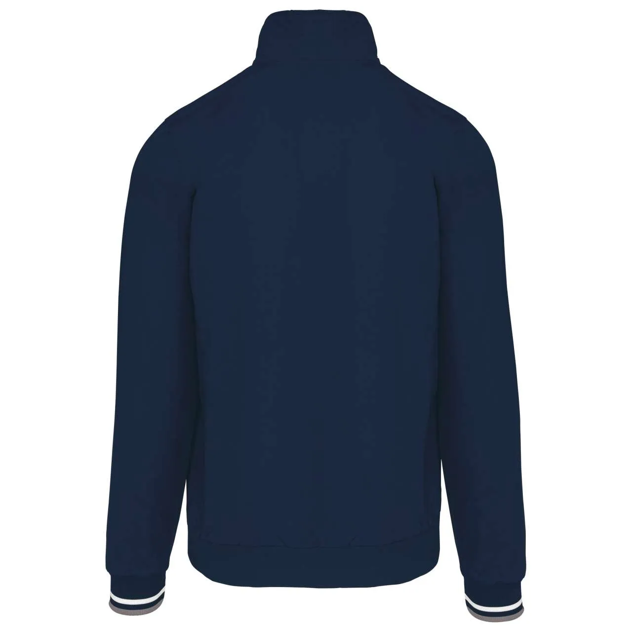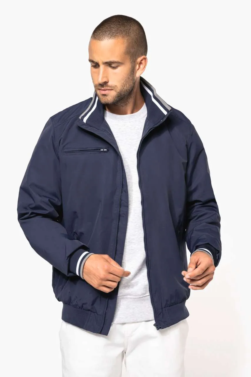 100% polyamide Taslan ottoman 100% polyester mesh lining Matt and hard-wearing fabric 2 zipped pockets at the front 1 zipped pocket at the chest 1 inner pocket Ribbed inner collar with contrasting stripes Mesh lining Plain ribbed hem Ribbed cuffs with contrasting stripes Zip access for decoration