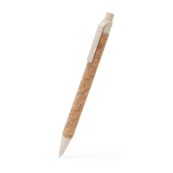 Eco-line ball pen with body in cork. Tip, push button and clip in wheat fibre. Blue ink.