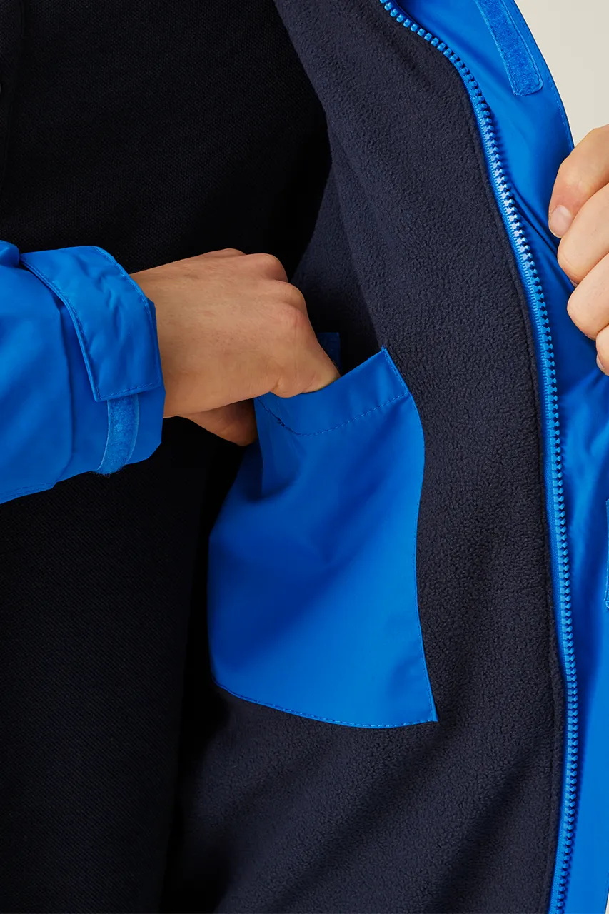 Fabric Information Waterproof Hydrafort polyester fabric 220 series anti-pill Symmetry fleece lined body Fleece lined collar Windproof fabric Thermo-Guard insulation in sleeves Taped seams Special Features Concealed hood with adjusters Stormflap with hook and loop Adjustable cuffs 2 lower zipped pockets Inner patch security pocket Concealed zip entrance in lining for embroidery access Made using recycled materials