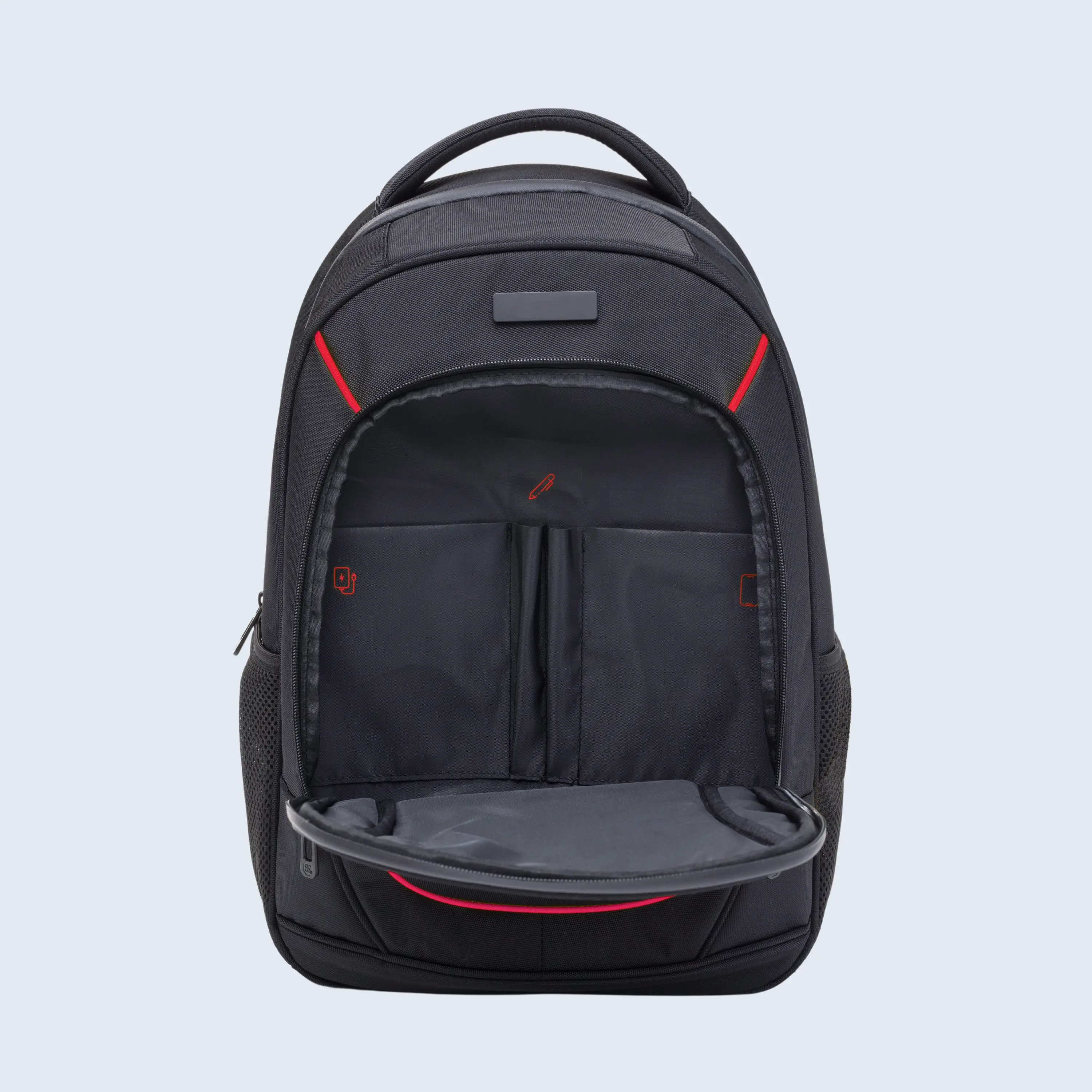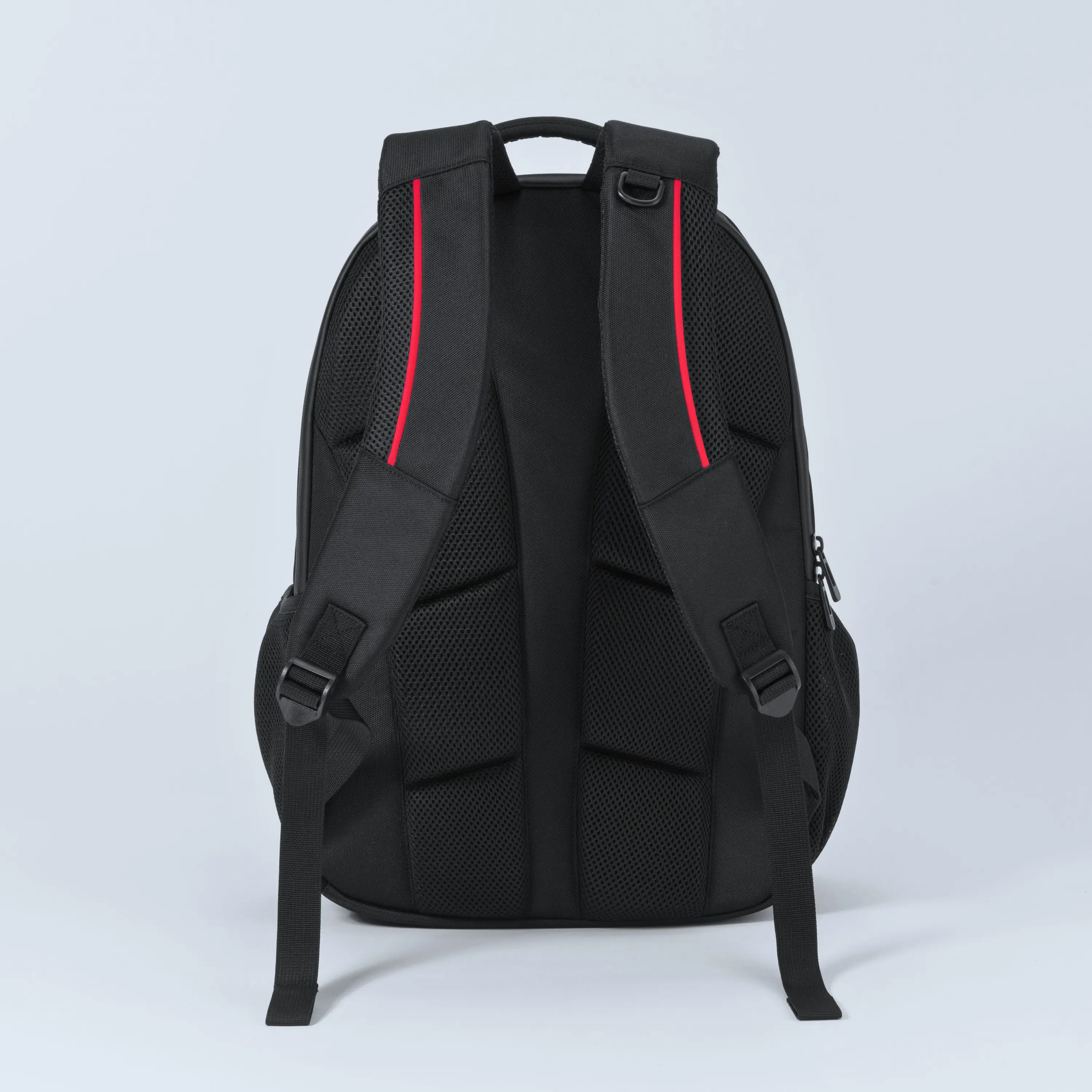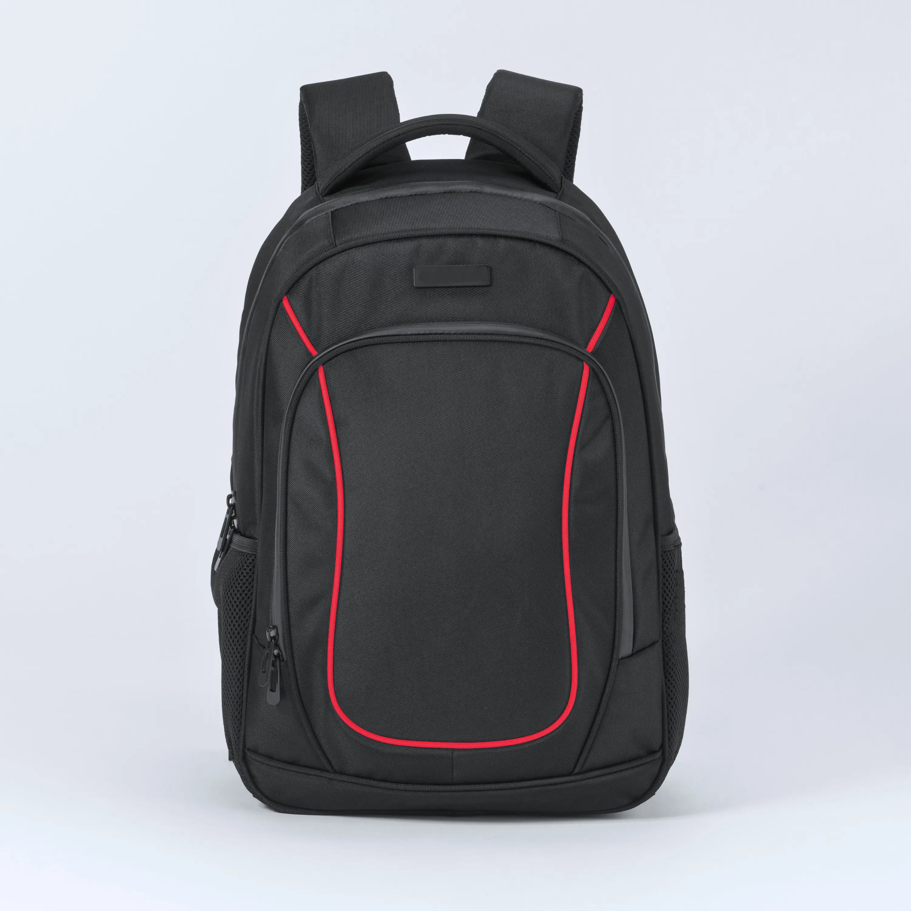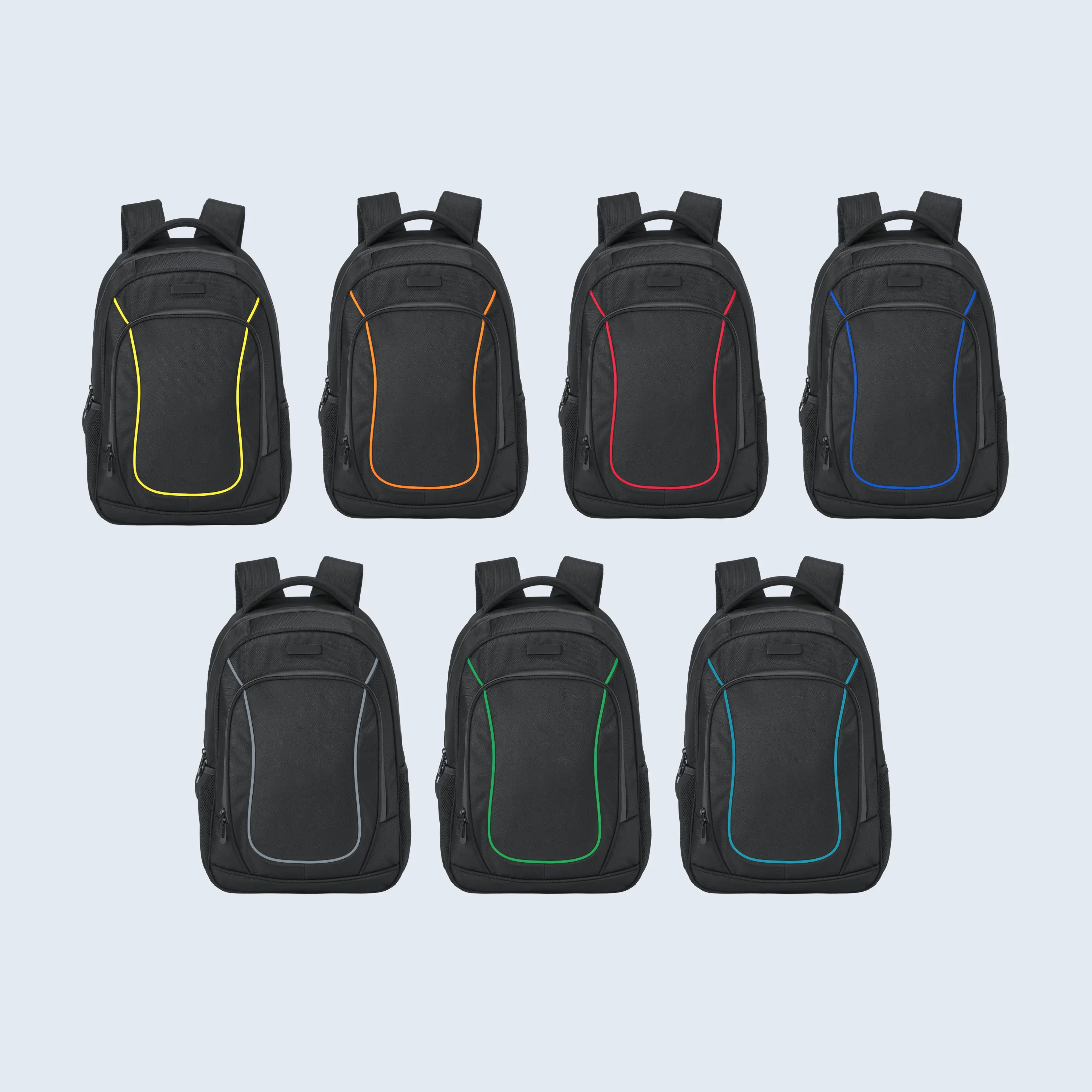 Two compartments backpack Dynamic is ideal for professionals, students, and travelers. With its thoughtfully designed compartments, comfortable features, and customizable branding, it is perfect for any occasion – from office use to weekend getaways. The combination of modern style and functionality makes it a versatile and practical accessory. • Made of damage-resistant 1260D polyester • A modern look in black with contrasting colourful lines that add elegance and make the backpack stand out. • A large, zippered compartment ideal for storing a laptop, books, documents, or a change of clothes. • Padded space designed to hold laptops up to 15.6 inches, providing excellent protection. • A front zippered pocket for quick access to small accessories • Side mesh pockets, perfect for a water bottle or umbrella. • Equipped with waterproof zippers for added protection against the elements. • Breathable back system • Padded, adjustable shoulder straps ensuring comfortable wear and a comfortable handle, allowing for easy carrying of the backpack by hand. • Reinforced walls for contents protection • Includes a metal plate on the front panel, designed as a dedicated space for your logo. • Capacity: 21 L
