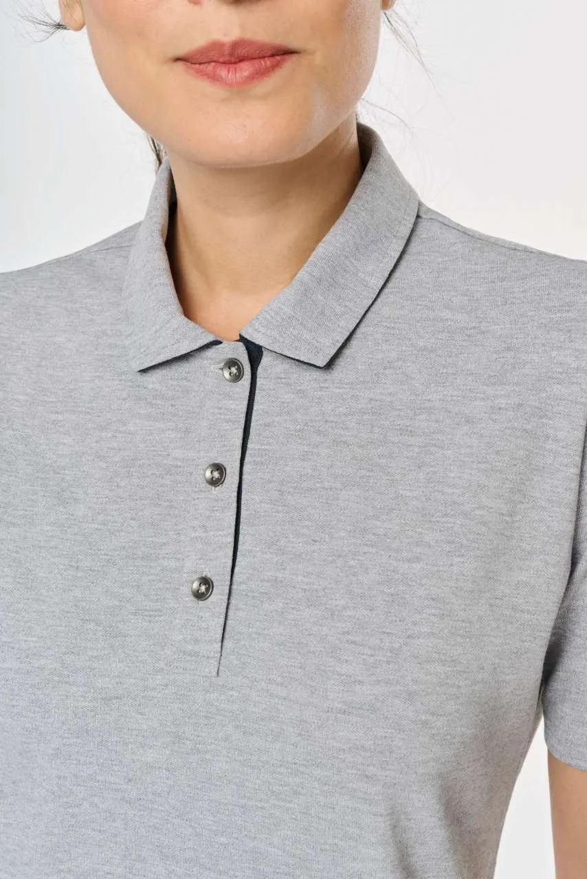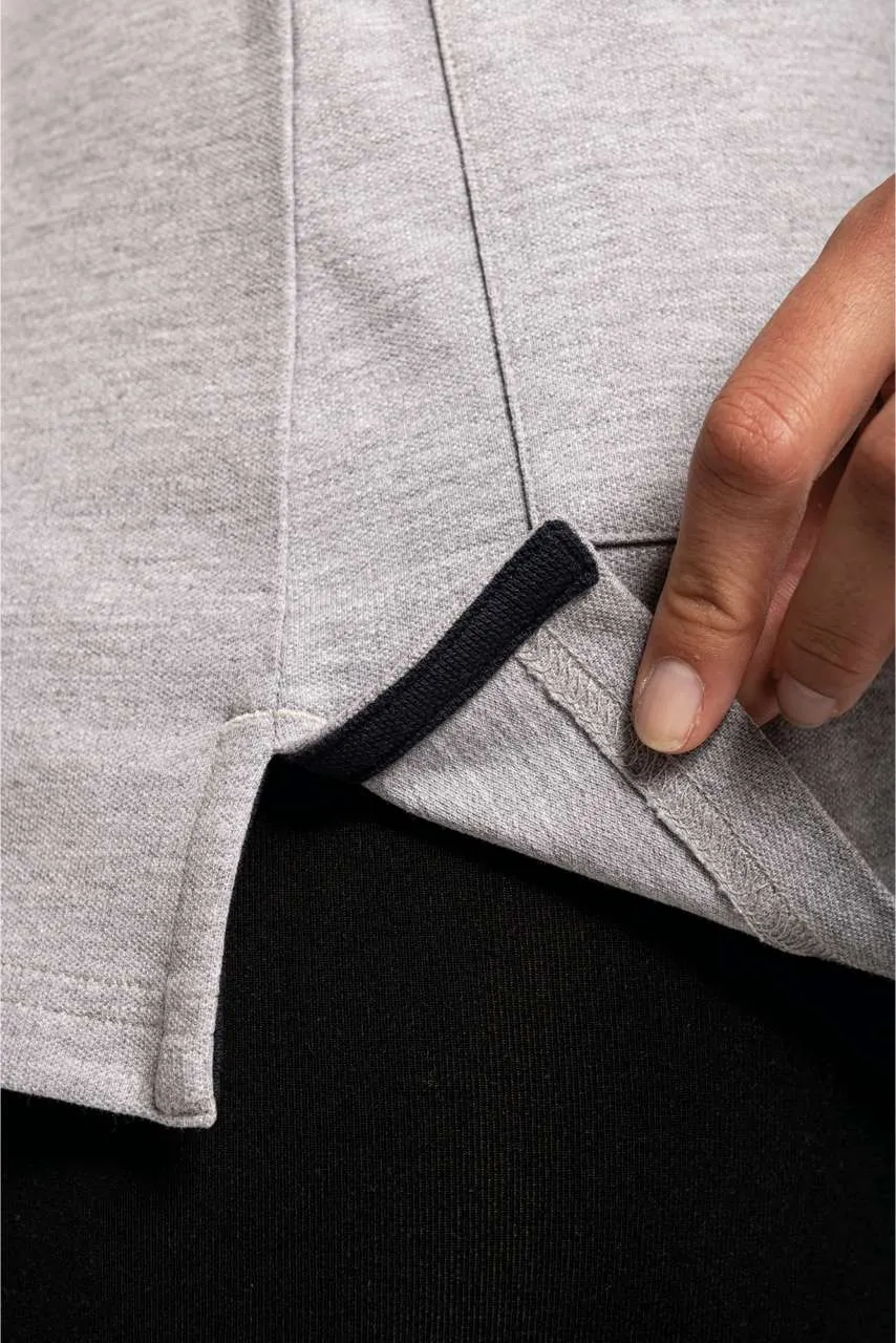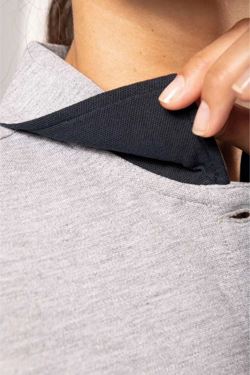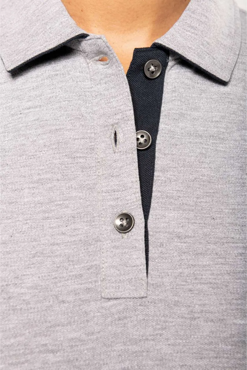 Plain colourways: 95% cotton/5% elastane Oxford Grey colourway: 85% cotton/12% viscose/3% elastane Piqué knit fabric Straight cut Washable at 60°C Piqué knit collar Contrasting inside placket and undercollar Placket with 3 metal buttons (1st buttonhole is horizontal) Contrasting tape inside neckline 2 front patch pockets at bottom hem 2 contrasting side slits for greater comfort Reinforced stitching at pocket corners Tubular finish at bottom hem and cuffs Tear-off brand label for ease of rebranding