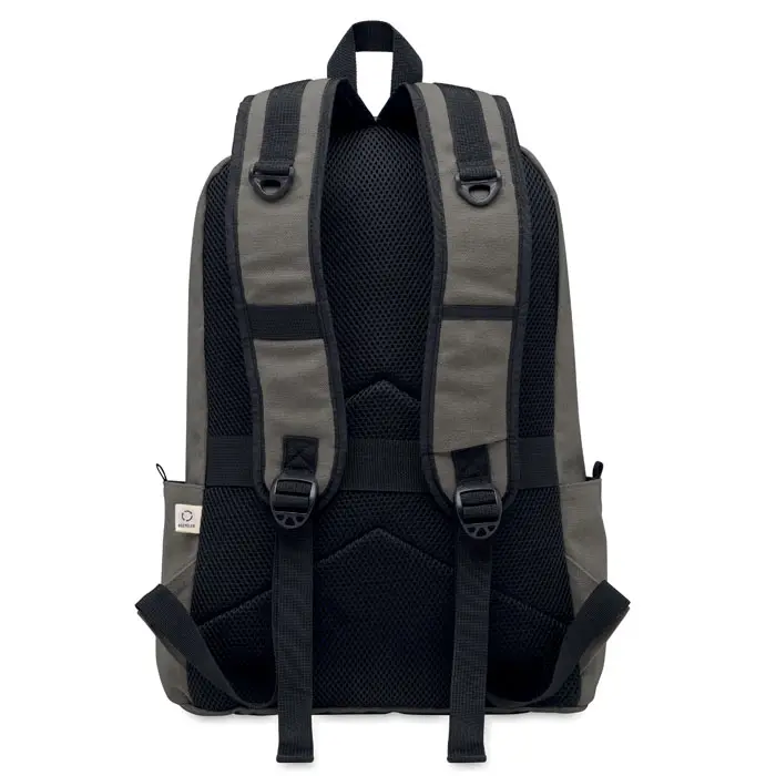 15inch laptop backpack in recycled washed canvas. Large front zippered pocket with inner laptop compartment. Small front zippered pocket. Two side-slip pockets. Padded back and shoulder straps, back panel and base. 450 gr/m².