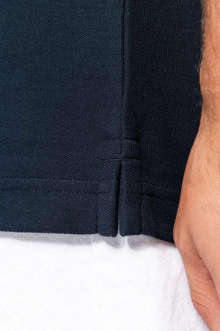 100% combed cotton For marled colours: 92% cotton / 8% viscose Piqué knit Slim fit Button placket at the neckline with 2 tone-on-tone buttons Taped neck in the main material at the neckline Side slits with trim in the main fabric Rib finishes with contrasting trim at the neckline and cuffs Twin-needle finish on the bottom hem