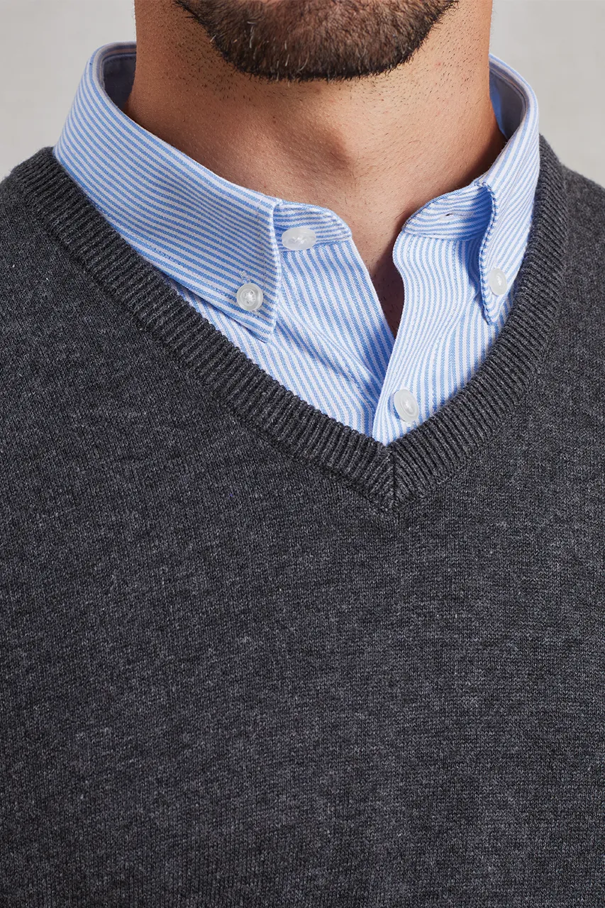 Fabric 55% Cotton, 45% Acrylic 12 Gauge Knit Features Cotton-rich long sleeve sweater V-neck styling Ribbed knit cuffs and hem Fine gauge knit Easy care