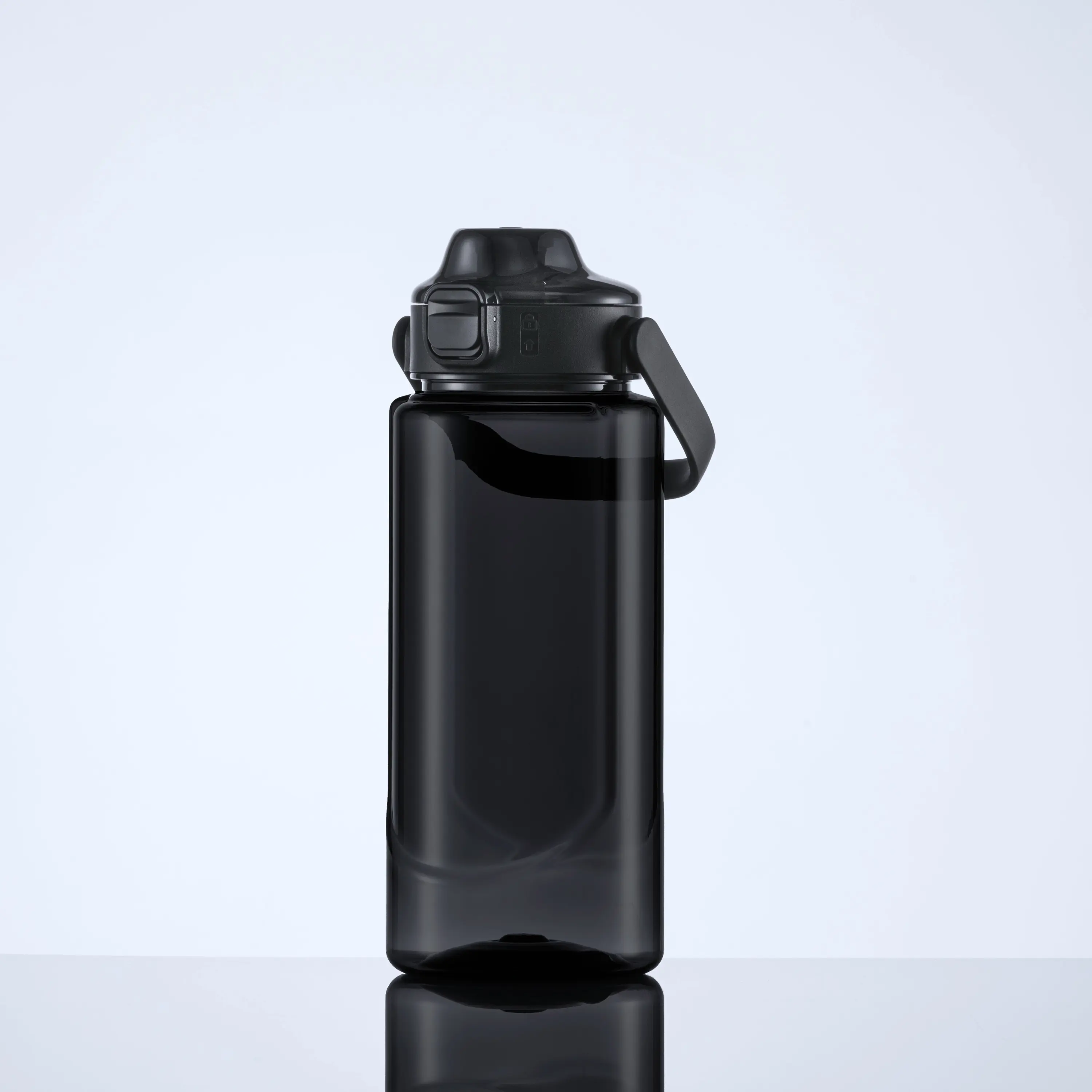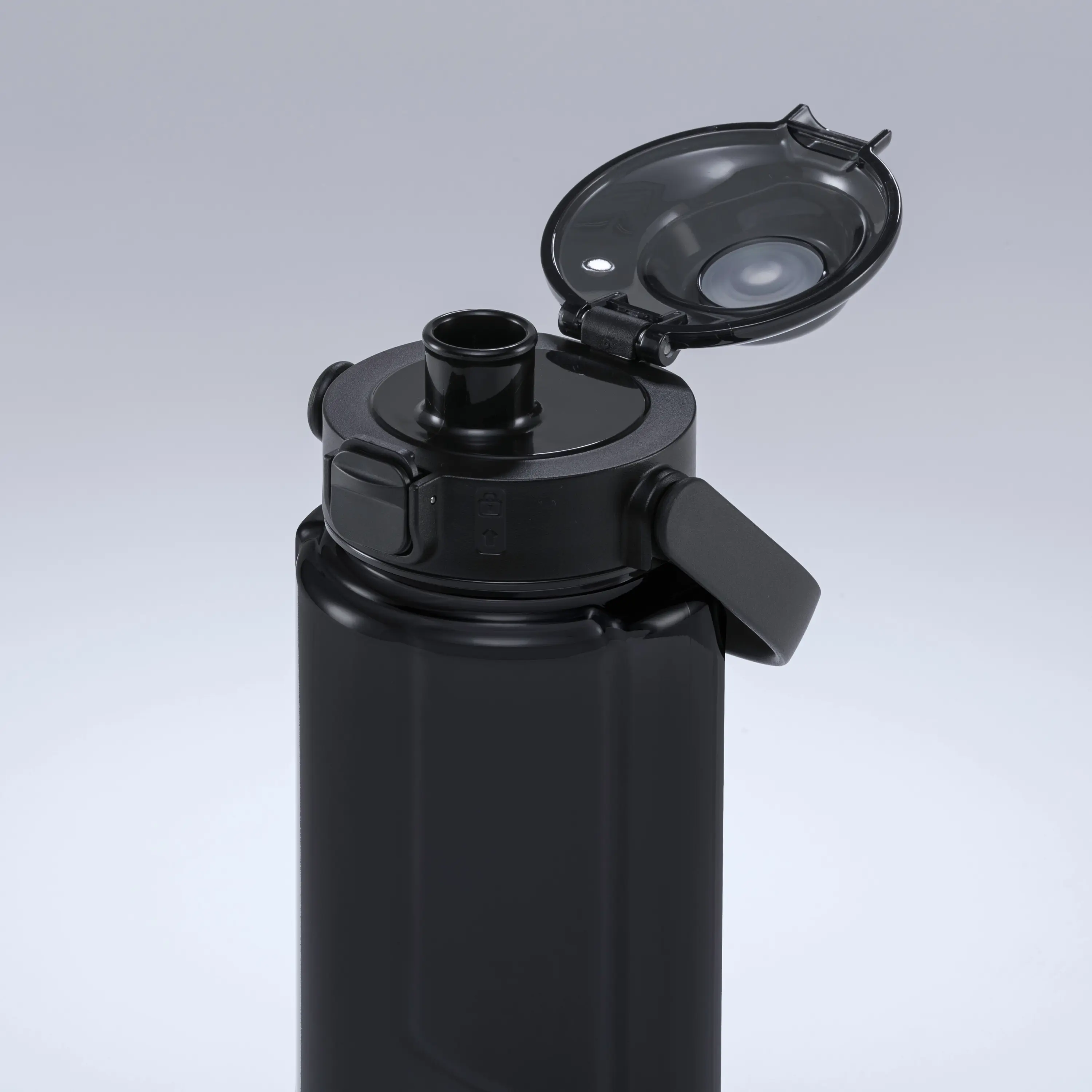 A practical flask-style bottle with an ergonomic handle, made from durable Eastman Tritan material, resistant to cracks and damage. Its innovative design features a convenient one-click opening mechanism. Thanks to the double leakproof seal, it ensures safe use, preventing spills. The wide opening allows for the placement of ice cubes inside. An ideal choice for the office, trips, or travel – functionality and convenience combined in one stylish model.