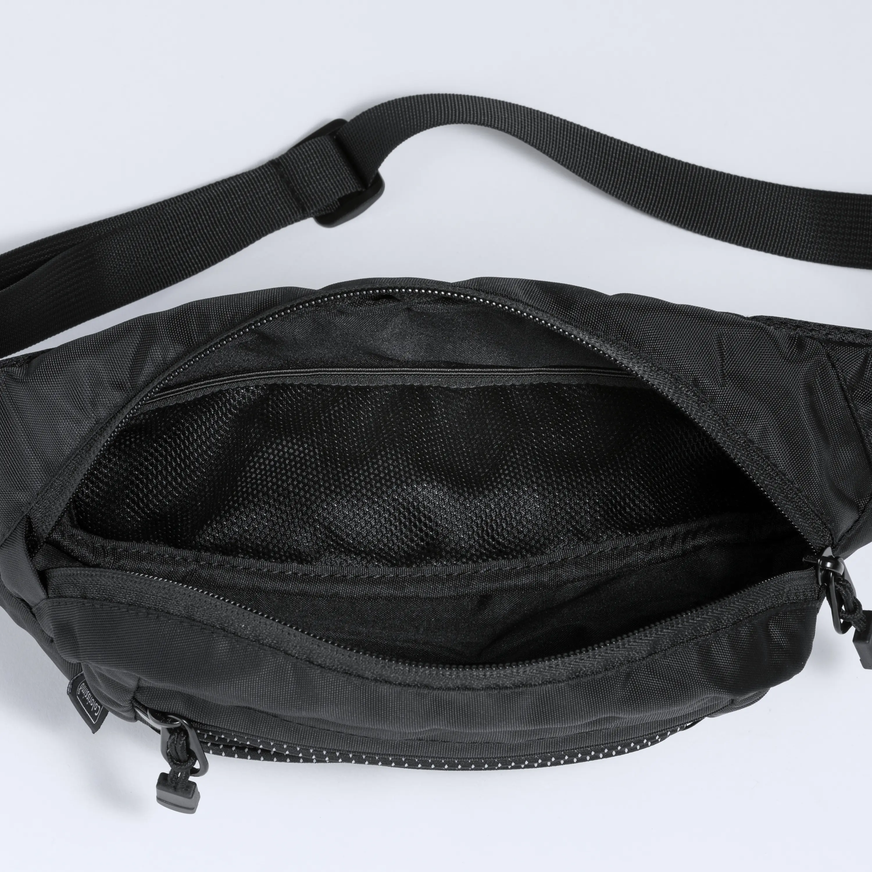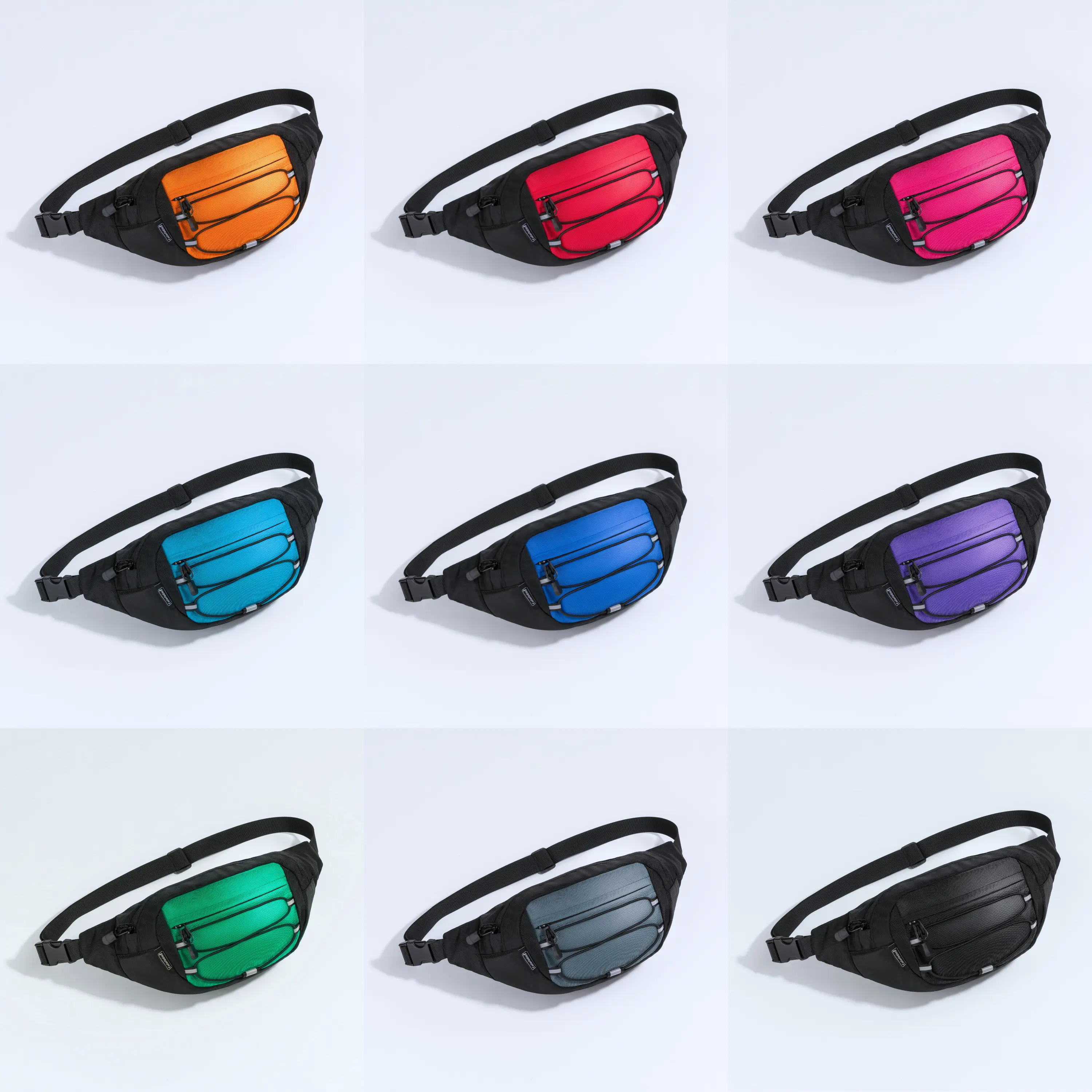 A modern and practical sports waist bag, perfect for runners, hikers, cyclists, and anyone who values comfort and functionality. Thanks to its thoughtful design, the bag allows easy access to stored items while ensuring their safety. A classic black base with contrasting colourful accents gives the product a dynamic and sporty appearance. • A spacious main pocket secured with a zipper. • Additional front pockets for smaller accessories such as keys, a wallet, or a phone. • The front is equipped with elastic bungee cords that allow you to attach lightweight items like gloves. Additionally, the bungee cords are secured to reflective elements, enhancing visibility and safety after dark. • The back of the waist bag is made from breathable mesh material, ensuring ventilation and comfort during wear. • A durable strap with a sturdy buckle allows for circumference adjustment, ensuring a comfortable fit to the body. • Lightweight design: The bag's weight and size make it comfortable to wear all day long. • Capacity: 2L