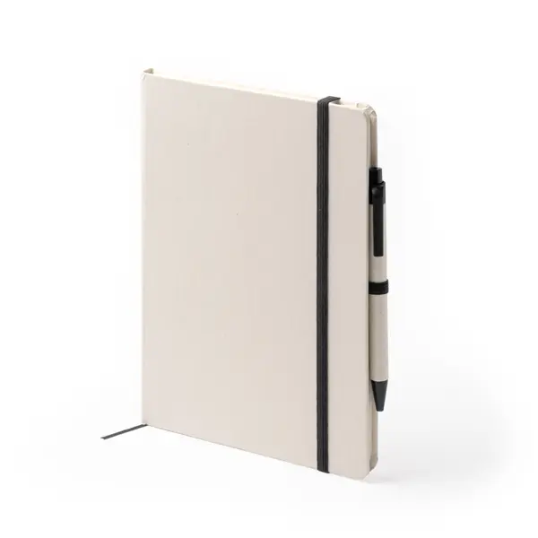 A5 notepad made from recycled milk cartons. Hard covers with elastic band and page marker. Blue ink ball pen included. 100 plain sheets.