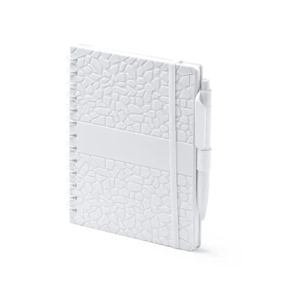 A5 notebook made from stone extracts. Hard covers and double springs. Matching ball pen and pen holder. Blue ink. 70 lined sheets.
