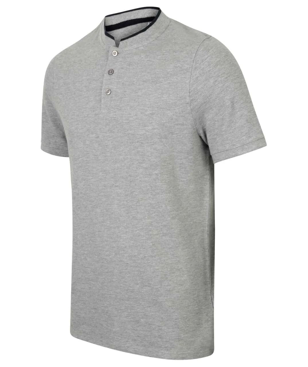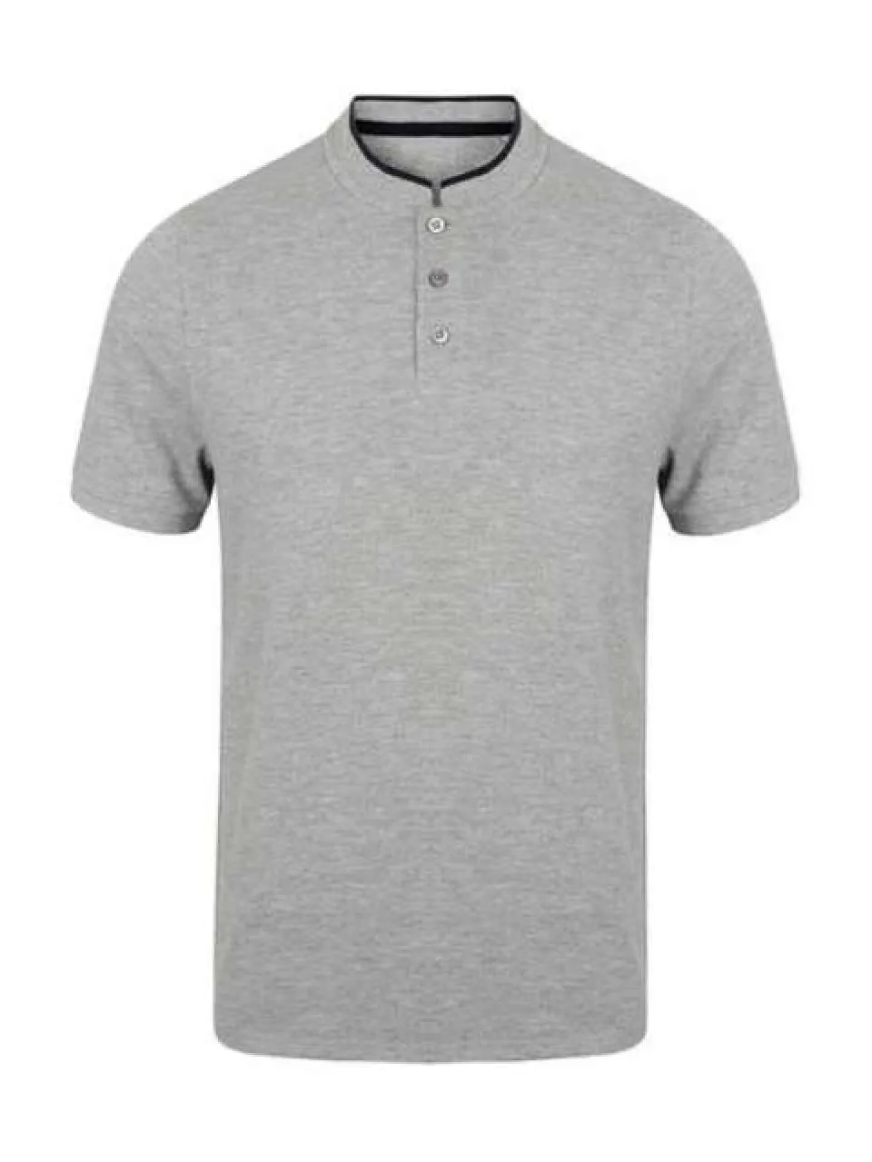 Stretch ribbed stand collar and cuffs Contrast back neck tape and tipped collar 3-button placket
