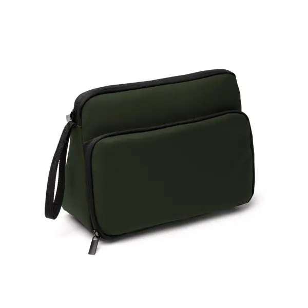 Triangular bag made of PU leather. Double main compartment with internal pockets. Front pocket with full opening and elastic dividers. Includes carrying strap.